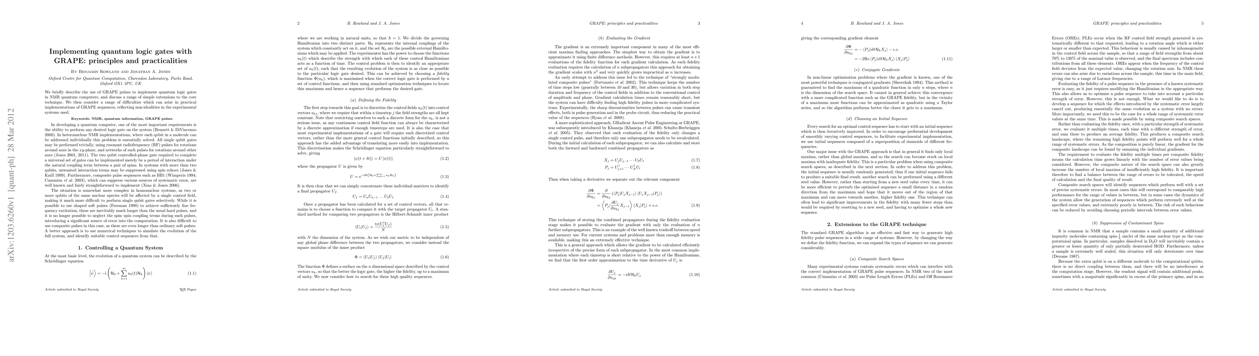 Summary: This paper outlines the use of GRAPE pulses for implementing quantum logic gates in NMR quantum computers, and explores practical extensions and challenges arising from non-ideal experimental conditions.