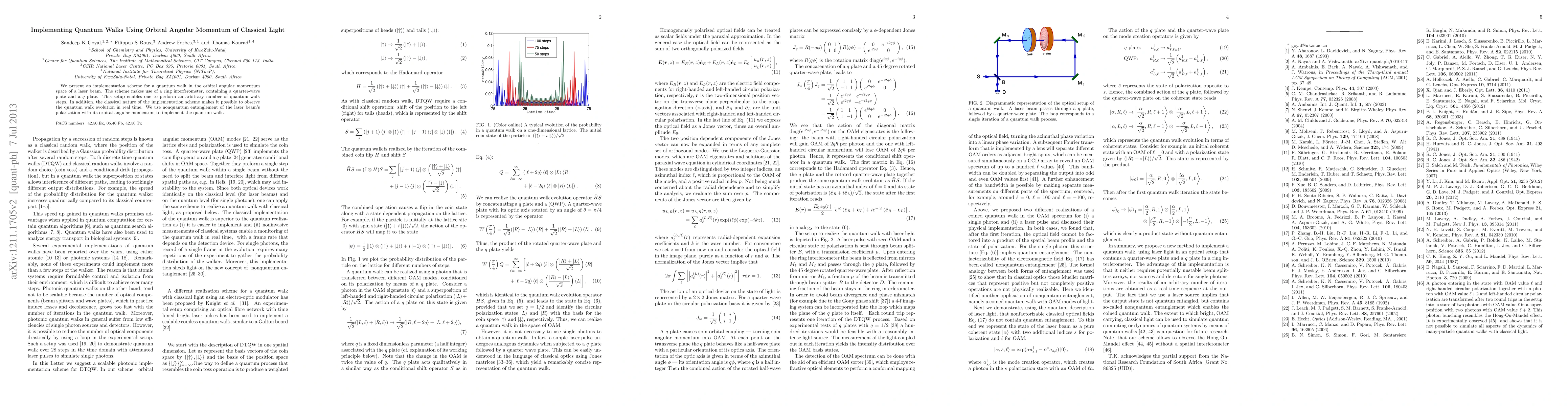 This paper proposes a classical implementation of quantum walks using the orbital angular momentum of a laser beam, utilizing a ring interferometer with a quarter-wave plate and a q plate to observe quantum walk evolution in real time. The scheme leverages nonquantum entanglement between the beam's polarization and orbital angular momentum.
