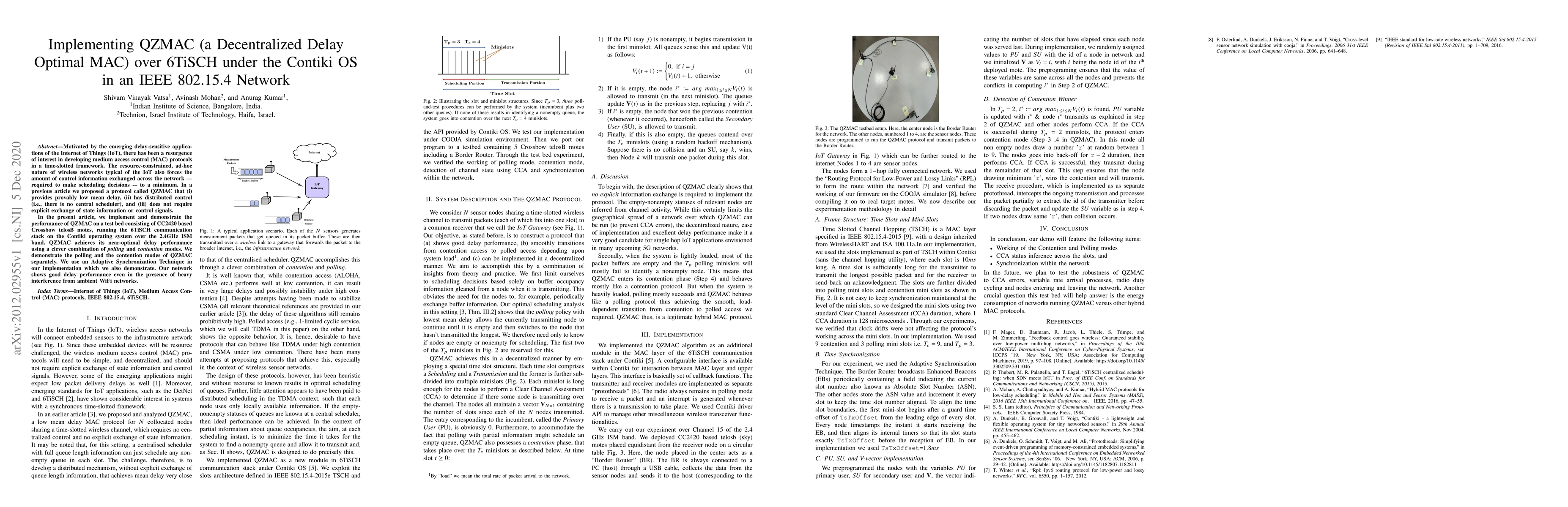 Motivated by the emerging delay-sensitive applications of the Internet of Things (IoT), there has been a resurgence of interest in developing medium access control (MAC) protocols in a time-slotted framework. The resource-constrained, ad-hoc nature of wireless networks typical of the IoT also forces the amount of control information exchanged across the network -- required to make scheduling decisions -- to a minimum. In a previous article we proposed a protocol called QZMAC that (i) provides provably low mean delay, (ii) has distributed control (i.e., there is no central scheduler), and (iii) does not require explicit exchange of state information or control signals. In the present article, we implement and demonstrate the performance of QZMAC on a test bed consisting of CC2420 based Crossbow telosB motes, running the 6TiSCH communication stack on the Contiki operating system over the 2.4GHz ISM band. QZMAC achieves its near-optimal delay performance using a clever combination of polling and contention modes. We demonstrate the polling and the contention modes of QZMAC separately. We use an Adaptive Synchronization Technique in our implementation which we also demonstrate. Our network shows good delay performance even in the presence of heavy interference from ambient WiFi networks.