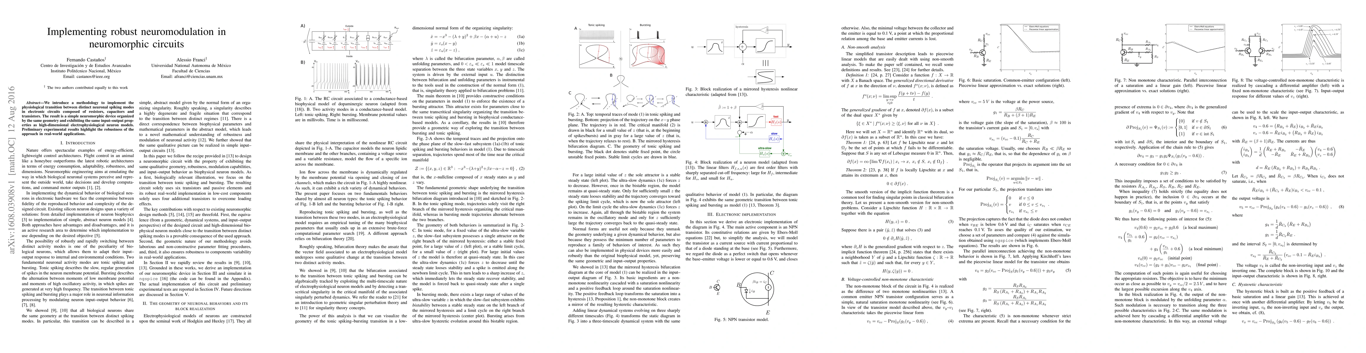 We introduce a methodology to implement the physiological transition {between distinct neuronal spiking modes} in electronic circuits composed of resistors, capacitors and transistors. The result is a simple neuromorphic device organized by the same geometry {and exhibiting the same input--output properties as} high-dimensional electrophysiological neuron models. {Preliminary} experimental results highlight the robustness of the approach in real-world applications.