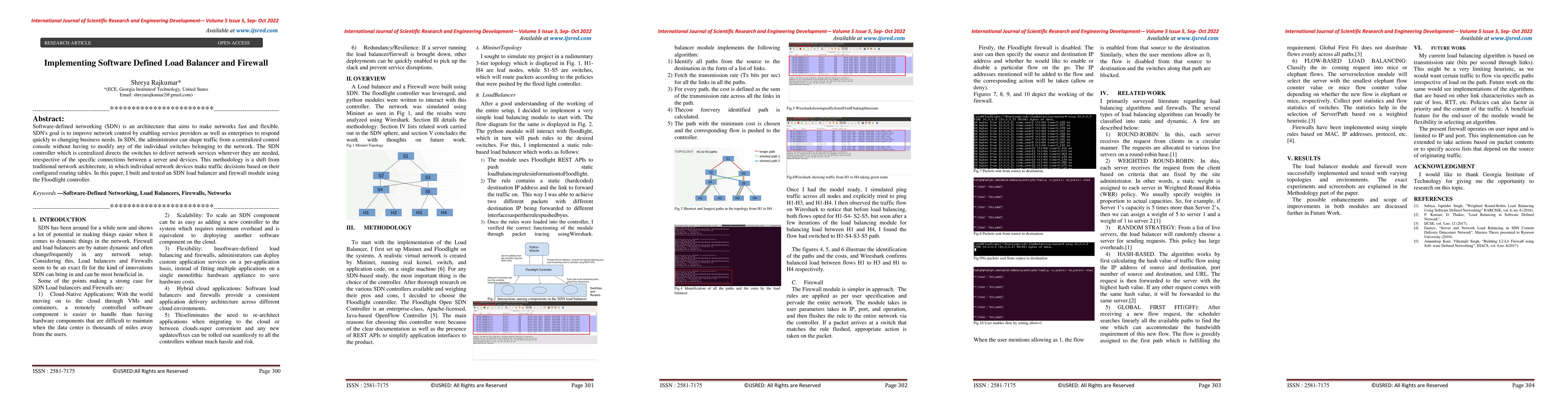 This paper explores the implementation of a Software Defined Load Balancer and Firewall using the Floodlight controller in an SDN environment. The study aims to demonstrate the flexibility and efficiency of SDN in managing network traffic and security through centralized control.