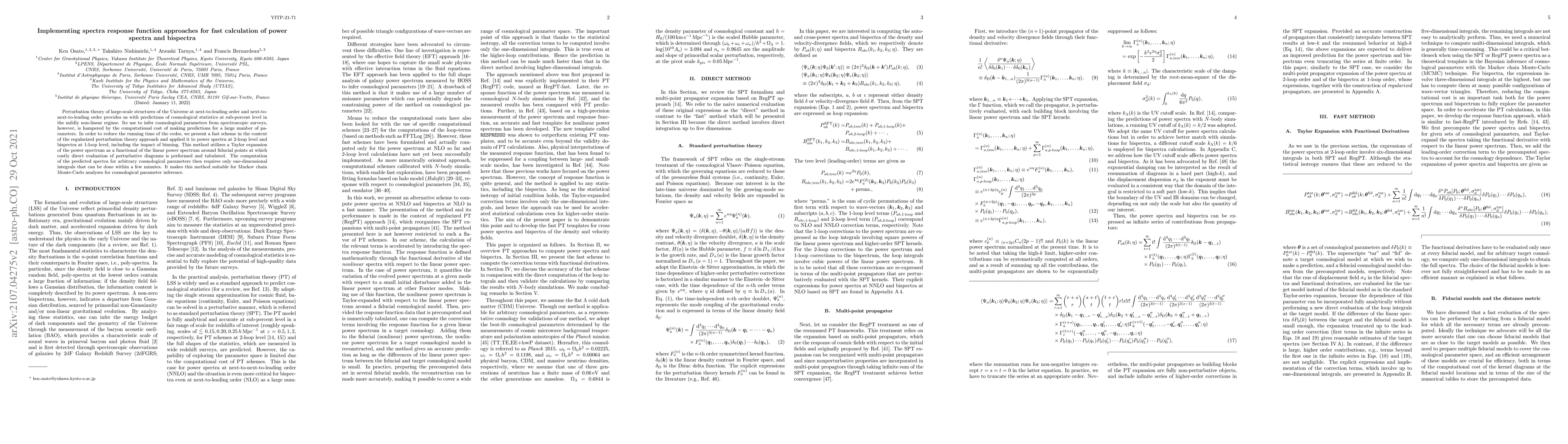 Perturbation theory of large-scale structures of the Universe at next-to-leading order and next-to-next-to-leading order provides us with predictions of cosmological statistics at sub-percent level in the mildly non-linear regime. Its use to infer cosmological parameters from spectroscopic surveys, however, is hampered by the computational cost of making predictions for a large number of parameters. In order to reduce the running time of the codes, we present a fast scheme in the context of the regularized perturbation theory approach and applied it to power spectra at 2-loop level and bispectra at 1-loop level, including the impact of binning. This method utilizes a Taylor expansion of the power spectrum as a functional of the linear power spectrum around fiducial points at which costly direct evaluation of perturbative diagrams is performed and tabulated. The computation of the predicted spectra for arbitrary cosmological parameters then requires only one-dimensional integrals that can be done within a few minutes. It makes this method suitable for Markov chain Monte-Carlo analyses for cosmological parameter inference.