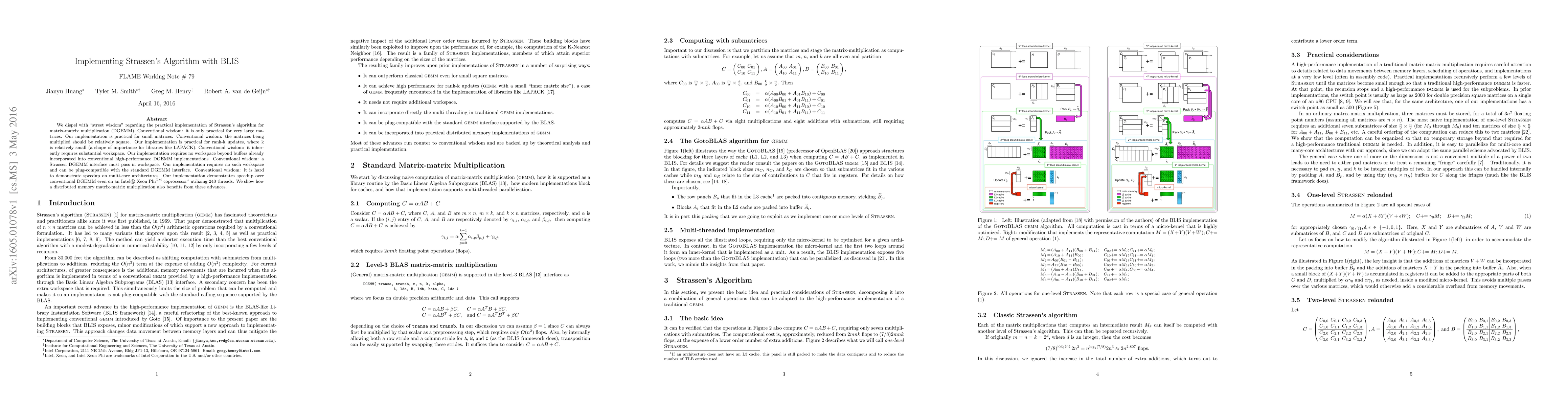 The research implemented Strassen's algorithm with BLIS (Blast Linear Algebra Subprograms) for matrix-matrix multiplication.