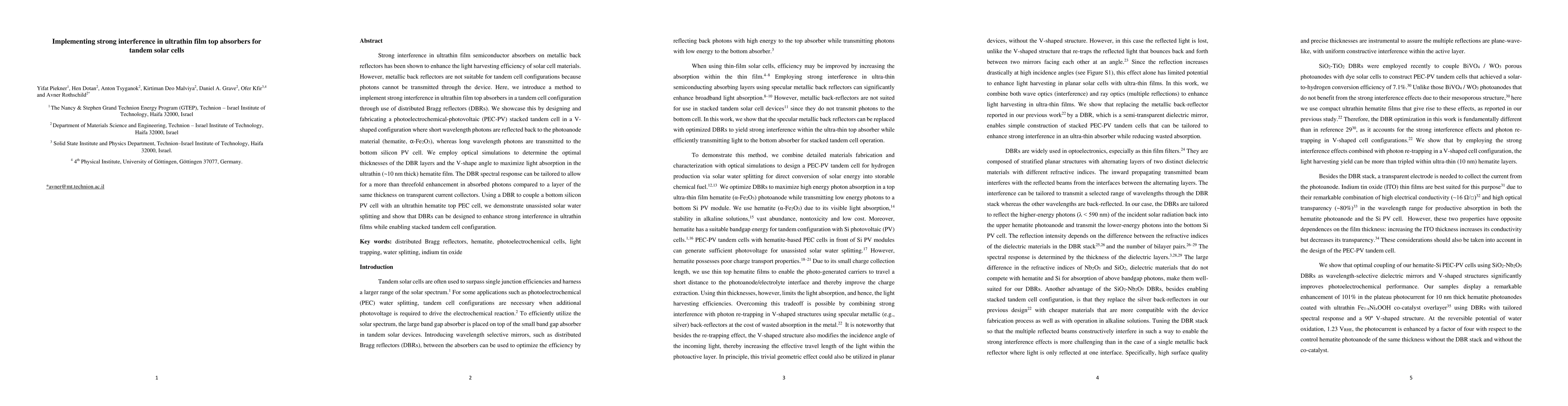 This paper introduces a method to implement strong interference in ultrathin film top absorbers using distributed Bragg reflectors (DBRs) for tandem solar cells, enhancing light harvesting efficiency. The study designs a V-shaped PEC-PV stacked tandem cell, achieving unassisted solar water splitting and demonstrating a more than threefold increase in absorbed photons compared to conventional transparent collectors.