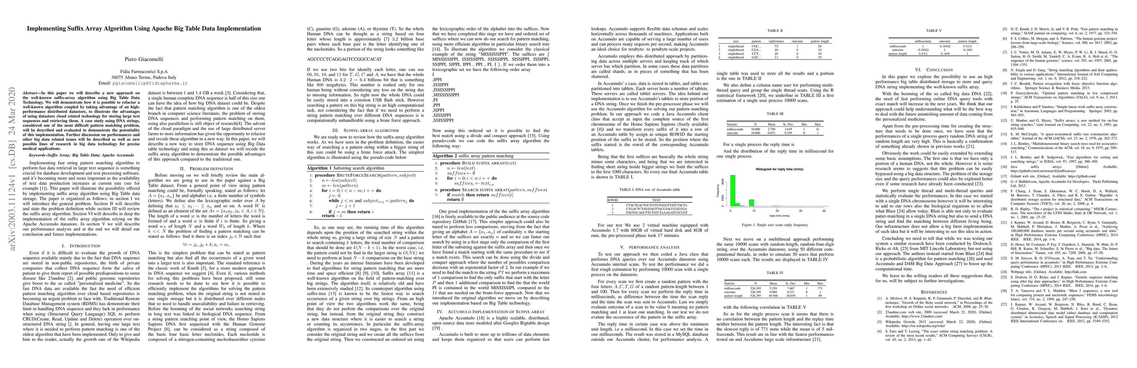 The paper describes an implementation of the suffix array algorithm using Apache Accumulo, a distributed data store, for efficient storage and querying of large DNA sequences.