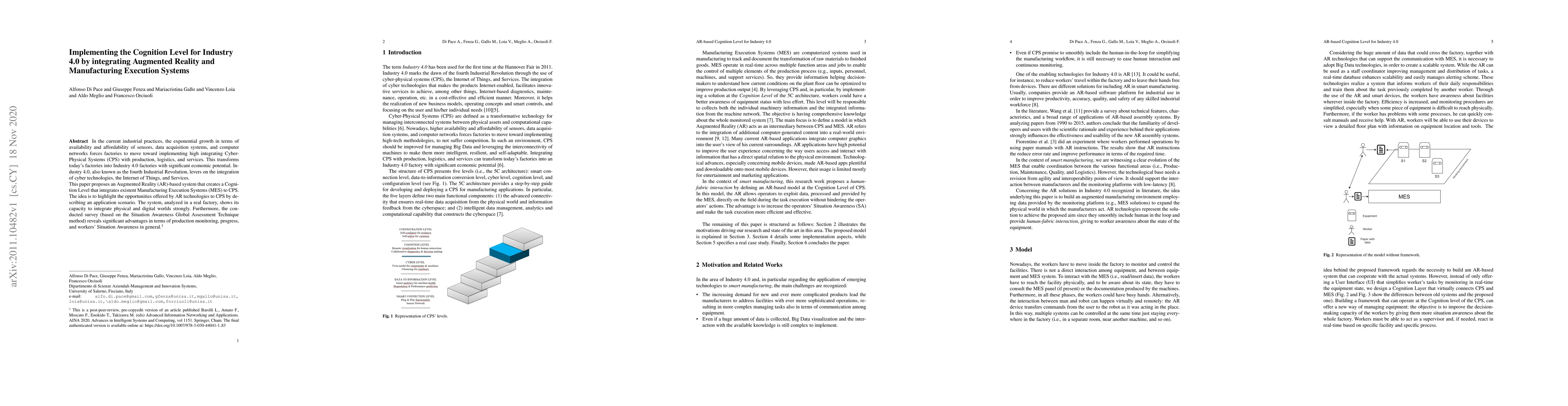 This paper proposes an Augmented Reality (AR)-based system to integrate Manufacturing Execution Systems (MES) with Cyber-Physical Systems (CPS), creating a Cognition Level for Industry 4.0. The system demonstrates significant benefits in production monitoring and workers' Situation Awareness in a real factory setting.