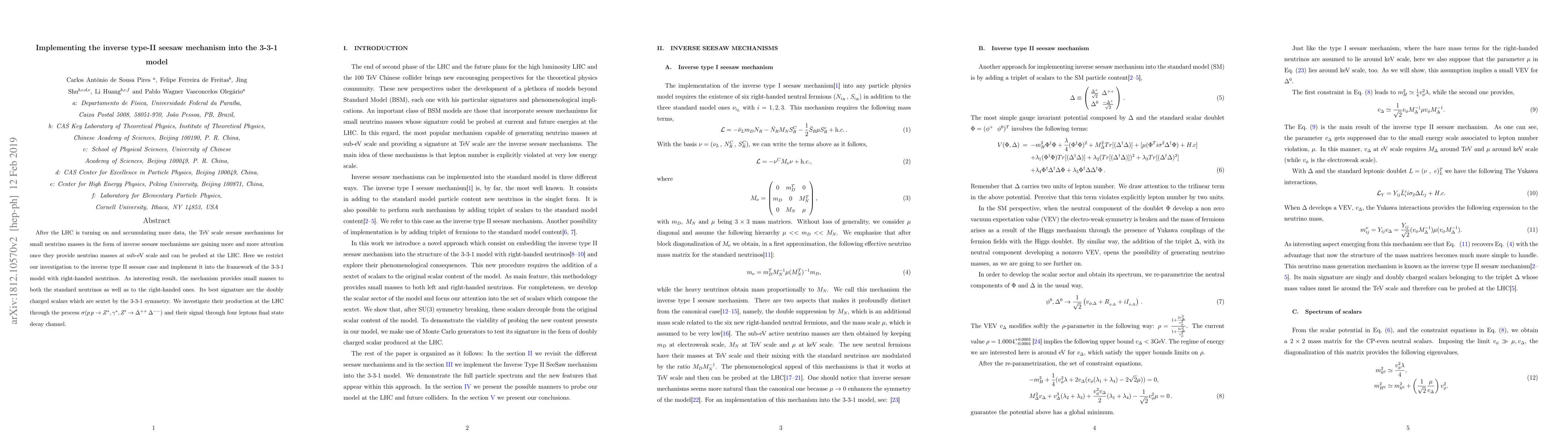 After the LHC is turning on and accumulating more data, the TeV scale seesaw mechanisms for small neutrino masses in the form of inverse seesaw mechanisms are gaining more and more attention once they provide neutrino masses at sub-eV scale and can be probed at the LHC. Here we restrict our investigation to the inverse type II seesaw case and implement it into the framework of the 3-3-1 model with right-handed neutrinos. As interesting result, the mechanism provides small masses to both the standard neutrinos as well as to the right-handed ones. Its best signature are the doubly charged scalars which are sextet by the 3-3-1 symmetry. We investigate their production at the LHC through the process $\sigma (p\,p \rightarrow Z^*, \gamma^* ,Z^{\prime} \rightarrow \Delta^{++}\,\Delta^{--})$ and their signal through four leptons final state decay channel.