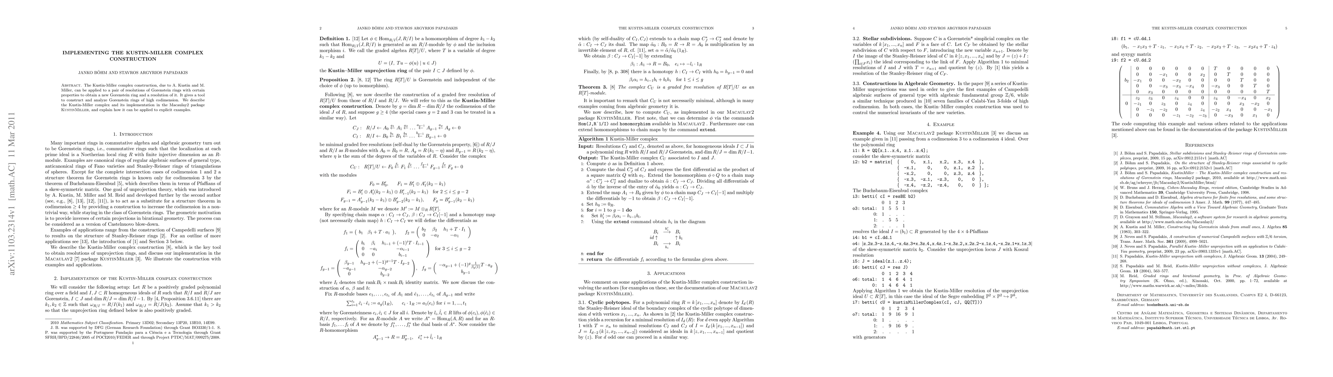 The Kustin-Miller complex construction, due to A. Kustin and M. Miller, can be applied to a pair of resolutions of Gorenstein rings with certain properties to obtain a new Gorenstein ring and a resolution of it. It gives a tool to construct and analyze Gorenstein rings of high codimension. We describe the Kustin-Miller complex and its implementation in the Macaulay2 package KustinMiller, and explain how it can be applied to explicit examples.