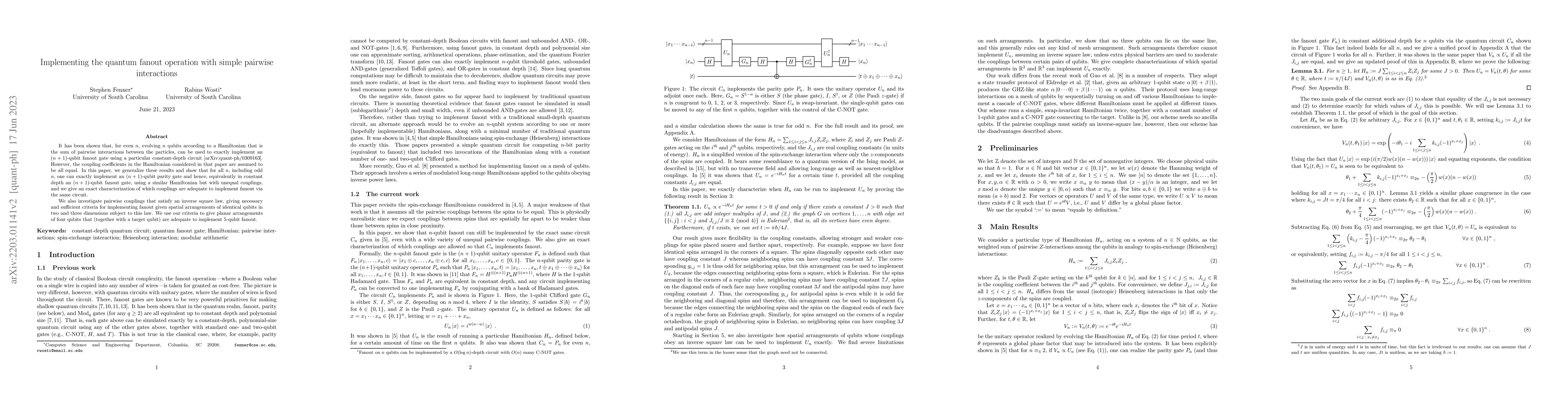This paper generalizes the implementation of quantum fanout operations using pairwise interactions, showing that unequal coupling coefficients can achieve the same effect for all $n$ qubits, including odd $n$. The authors also provide criteria for implementing fanout under an inverse square law, demonstrating specific planar arrangements of qubits for 5-qubit fanout.