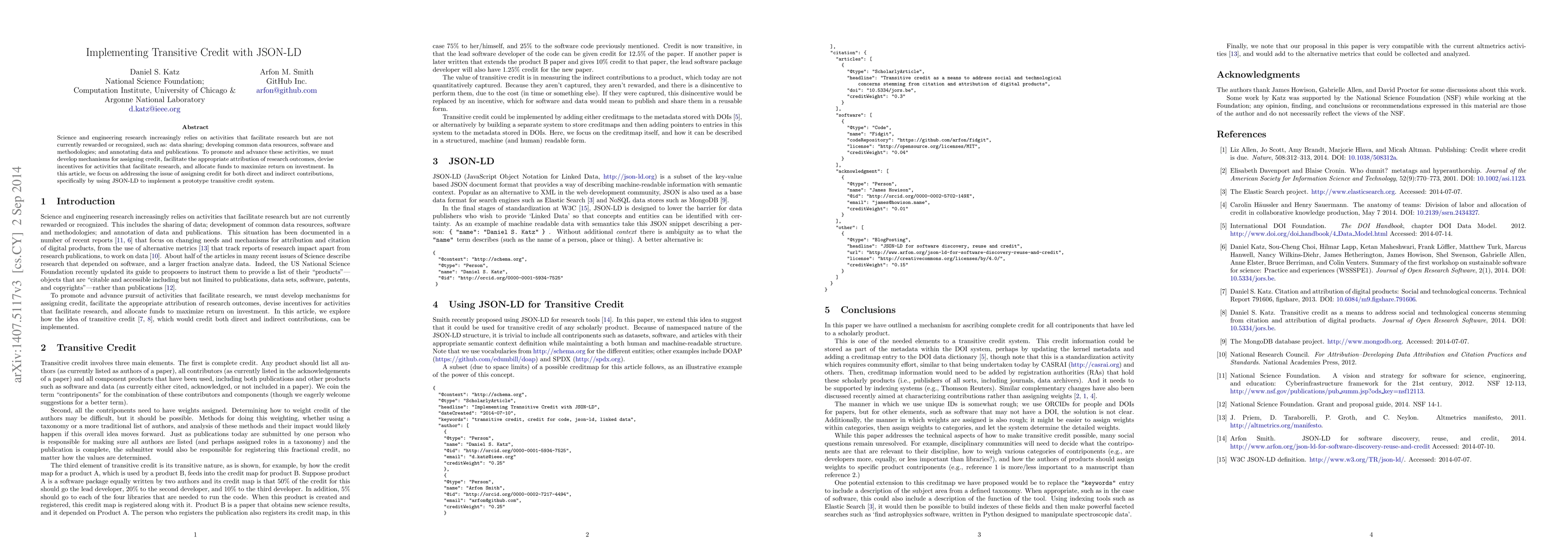 Science and engineering research increasingly relies on activities that facilitate research but are not currently rewarded or recognized, such as: data sharing; developing common data resources, software and methodologies; and annotating data and publications. To promote and advance these activities, we must develop mechanisms for assigning credit, facilitate the appropriate attribution of research outcomes, devise incentives for activities that facilitate research, and allocate funds to maximize return on investment. In this article, we focus on addressing the issue of assigning credit for both direct and indirect contributions, specifically by using JSON-LD to implement a prototype transitive credit system.
