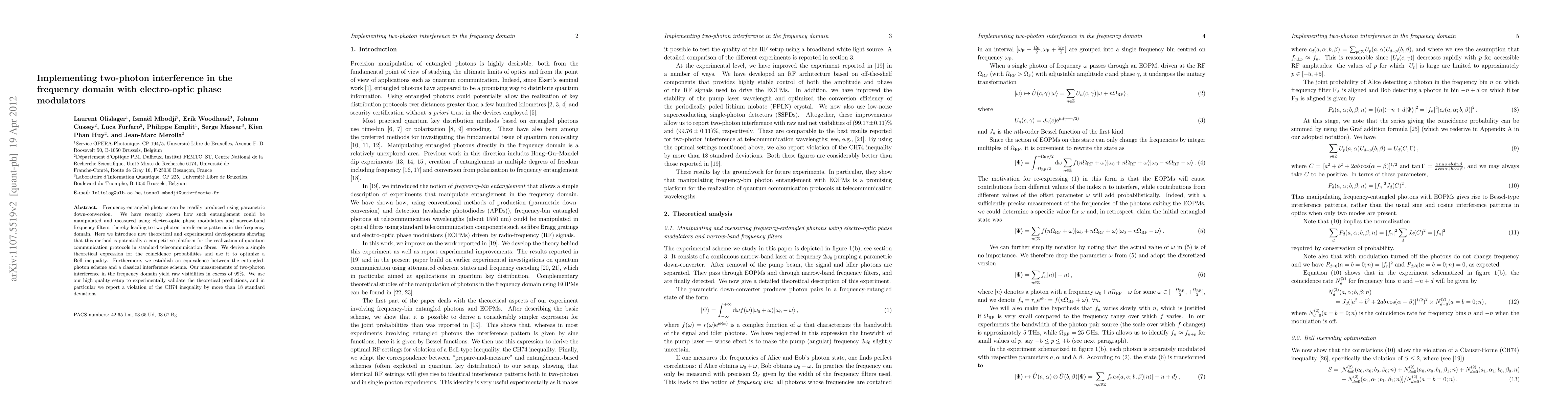 This paper presents advancements in generating and measuring two-photon interference in the frequency domain using electro-optic phase modulators, achieving high visibility and validating theoretical predictions with a significant violation of the CH74 inequality, positioning this method as a viable platform for quantum communication.