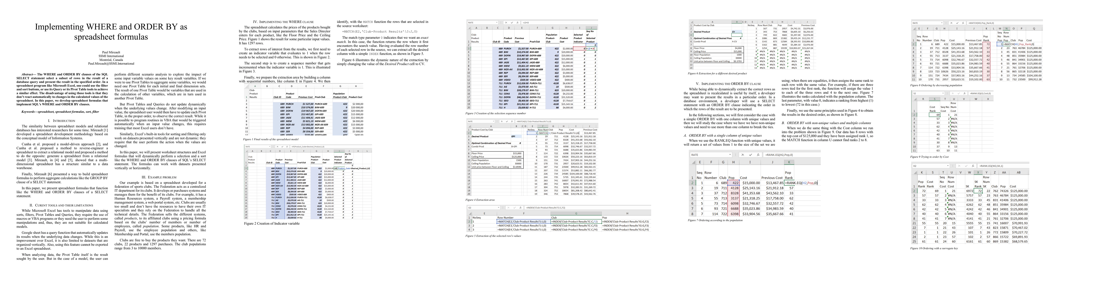 This paper proposes spreadsheet formulas to replicate SQL's WHERE and ORDER BY clauses, enabling dynamic filtering and sorting in Excel that automatically update with changes in the spreadsheet data. Traditional spreadsheet tools lack this reactive capability.