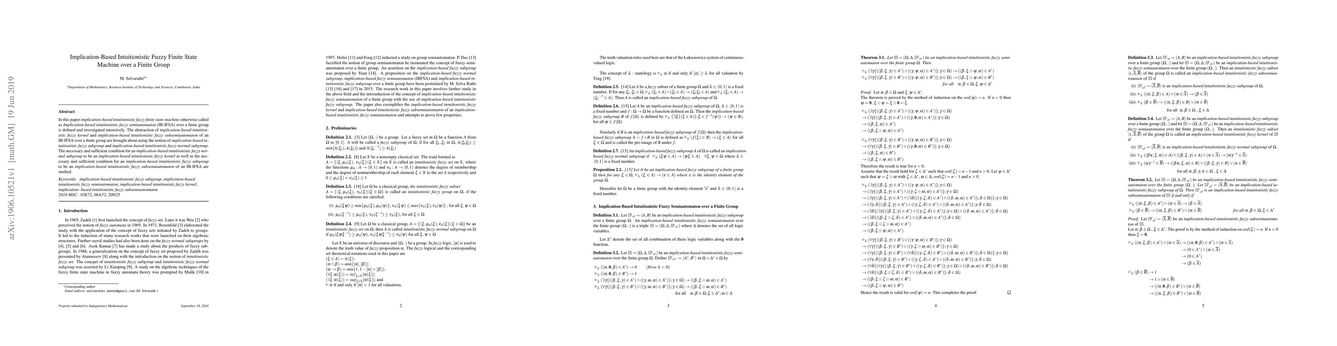 In this paper implication-based intuitionistic fuzzy finite state machine otherwise called as Implication-based intuitionistic fuzzy semiautomaton (IB-IFSA) over a finite group is defined and investigated intensively. The abstraction of implication-based intuitionistic fuzzy kernel and implication-based intuitionistic fuzzy subsemiautomaton of an IB-IFSA over a finite group are brought about using the notion of implication-based intuitionistic fuzzy subgroup and implication-based intuitionistic fuzzy normal subgroup. The necessary and sufficient condition for an implication-based intuitionistic fuzzy normal subgroup to be an implication-based intuitionistic fuzzy kernel as well as the necessary and sufficient condition for an implication-based intuitionistic fuzzy subgroup} to be an implication-based intuitionistic fuzzy subsemiautomaton of an IB-IFSA are studied.