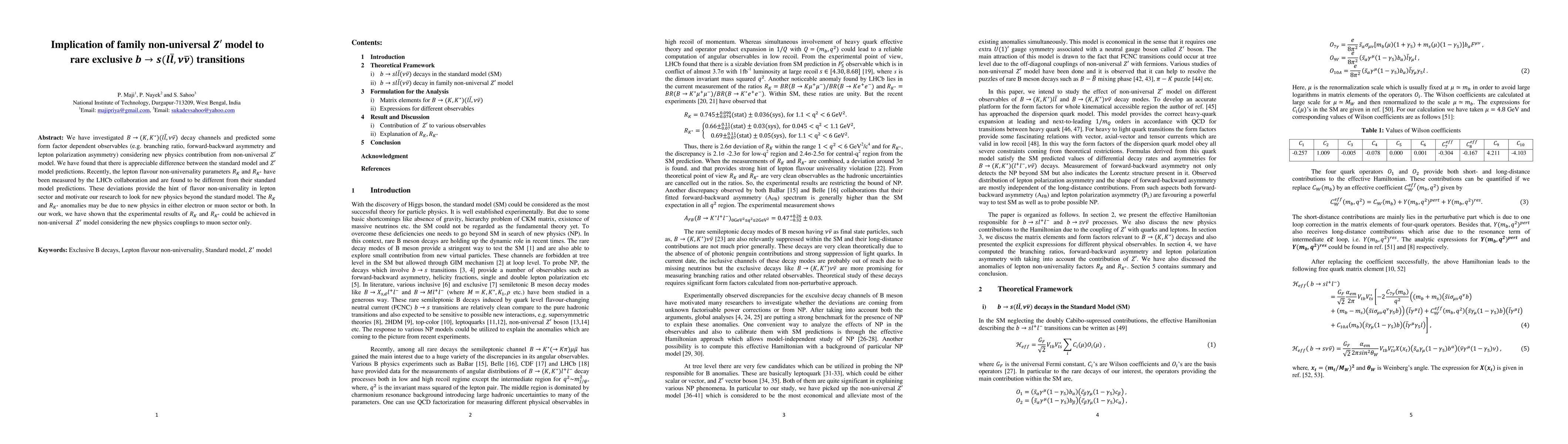 We have investigated $B \to (K,K^*)(l\bar l,\nu\bar\nu)$ decay channels and predicted some form factor dependent observables (e.g. branching ratio, forward-backward asymmetry and lepton polarization asymmetry) considering new physics contribution from non-universal $Z'$ model. We have found that there is appreciable difference between the standard model and $Z'$ model predictions. Recently, the lepton flavour non-universality parameters $R_K$ and $R_{K^*}$ have been measured by the LHCb collaboration and are found to be different from their standard model predictions. These deviations provide the hint of flavor non-universality in lepton sector and motivate our research to look for new physics beyond the standard model. The $R_K$ and $R_{K^*}$ anomalies may be due to new physics in either electron or muon sector or both. In our work, we have shown that the experimental results of $R_K$ and $R_{K^*}$ could be achieved in non-universal $Z'$ model considering the new physics couplings to muon sector only.