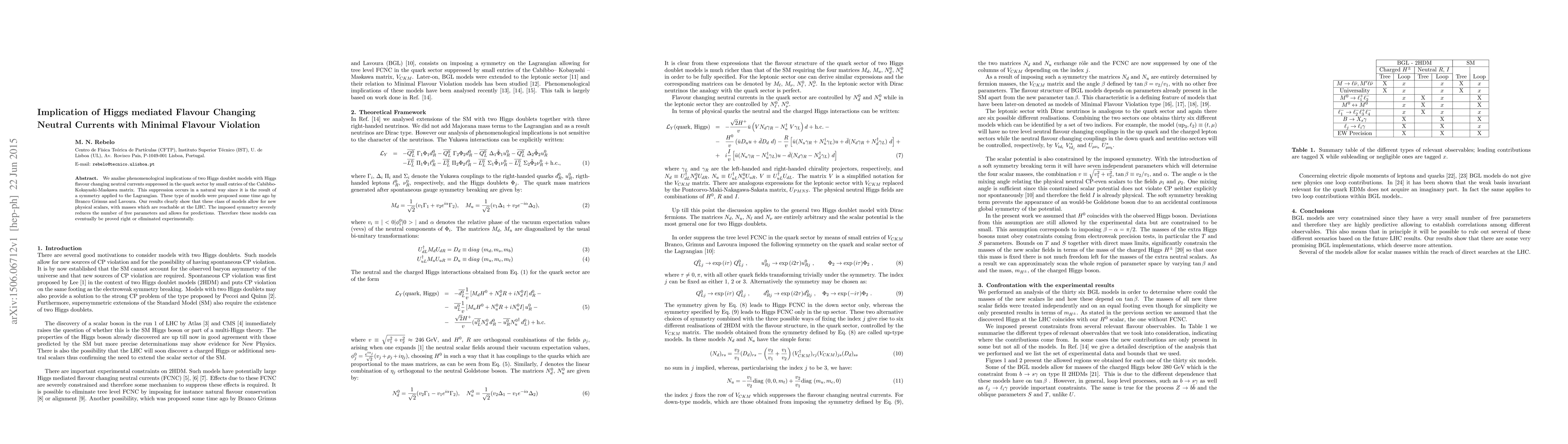 The research analyzes phenomenological implications of two Higgs doublet models with Higgs flavor changing neutral currents (FCNC) suppressed in the quark sector by small entries of the Cabibbo-Kokayashi-Maskawa (CKM) matrix. This suppression is achieved through a symmetry applied to the Lagrangian, reducing the number of free parameters and allowing for predictions.