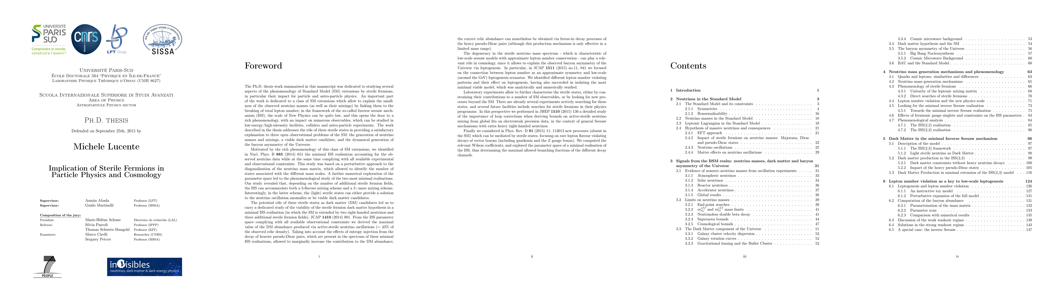 The neutrino mass generation mechanism, the nature of dark matter and the origin of the baryon asymmetry of the Universe are three compelling questions that cannot be accounted for in the Standard Model of particle physics. In this thesis we focus on all these issues by providing a possible solution in terms of a minimal extension of the Standard Model, consisting in the addition of a set of sterile fermions to the field content of the theory. Sterile fermions are gauge singlet fields, that can interact via mixing with the active neutrinos. We focus on the Inverse Seesaw mechanism, which is characterised by a low (TeV or lower) new physics scale and that can be tested in current and future experimental facilities. We present the model building analysis that points towards the minimal realisations of the mechanism, and the phenomenological study in order to accommodate light neutrino masses and to impose all the relevant experimental constraints in the model, as well as the expected experimental signatures. We show the viability of the sterile neutrino hypothesis as dark matter component, together with the characteristic features of this scenario in the minimal Inverse Seesaw mechanism. The possibility of successfully accounting for the baryon asymmetry in a testable realisation of the leptogenesis mechanism is also addressed. On the other hand it is important to look for manifestations of sterile fermions in laboratory experiments. We address this point by making predictions for the expected rates of rare lepton number violating decays of vector bosons, that can be mediated by sterile fermions, as well as by studying the impact of sterile fermions on global fit of electroweak precision data.