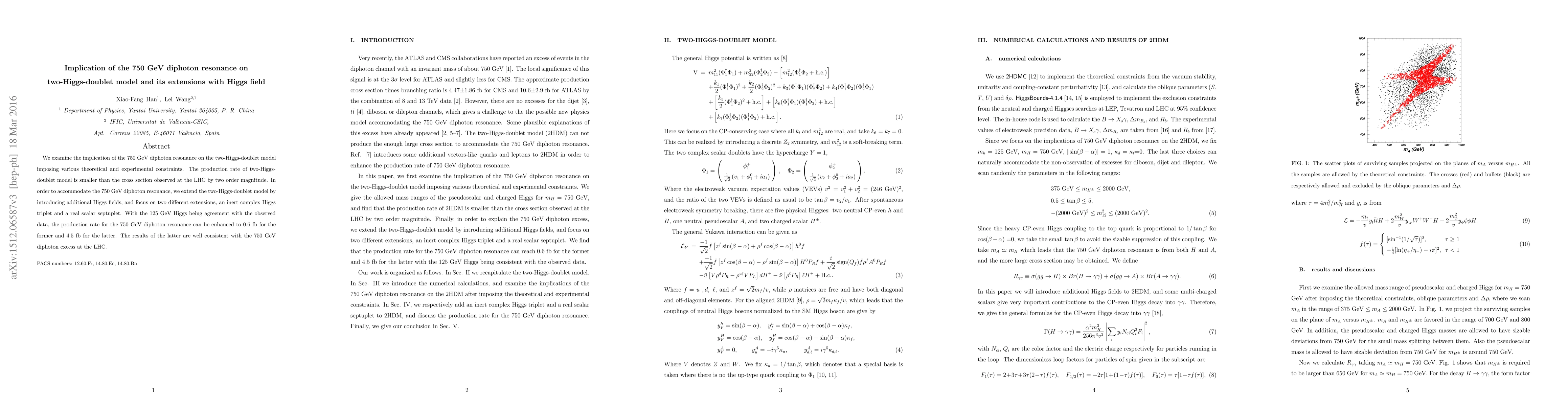 We examine the implication of the 750 GeV diphoton resonance on the two-Higgs-doublet model imposing various theoretical and experimental constraints. The production rate of two-Higgs-doublet model is smaller than the cross section observed at the LHC by two order magnitude. In order to accommodate the 750 GeV diphoton resonance, we extend the two-Higgs-doublet model by introducing additional Higgs fields, and focus on two different extensions, an inert complex Higgs triplet and a real scalar septuplet. With the 125 GeV Higgs being agreement with the observed data, the production rate for the 750 GeV diphoton resonance can be enhanced to 0.6 fb for the former and 4.5 fb for the latter. The results of the latter are well consistent with the 750 GeV diphoton excess at the LHC.