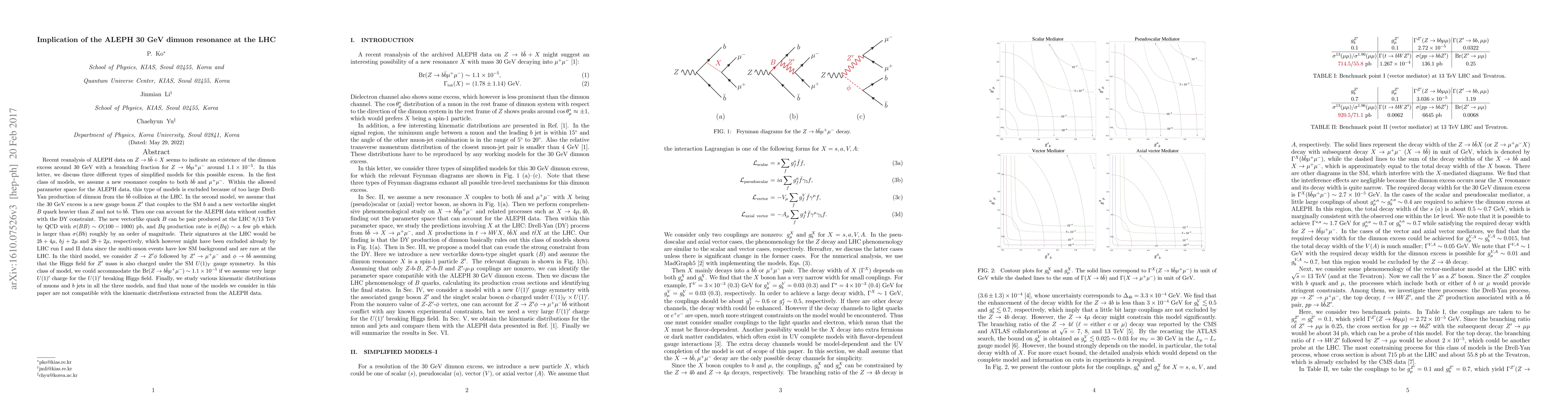 Recent reanalysis of ALEPH data on Z -> b bar{b} + X seems to indicate an existence of the dimuon excess around 30 GeV with a branching fraction for Z -> b bar{b} mu^+ mu^- around 1.1 X 10^{-5}. In this letter, we discuss three different types of simplified models for this possible excess. In the first class of models, we assume a new resonance couples to both b bar{b} and mu^+ mu^-. Within the allowed parameter space for the ALEPH data, this type of models is excluded because of too large Drell-Yan production of dimuon from the b bar{b} collision at the LHC. In the second model, we assume that the 30 GeV excess is a new gauge boson Z' that couples to the SM b and a new vectorlike singlet B quark heavier than Z and not to b bar{b}. Then one can account for the ALEPH data without conflict with the DY constraint. The new vectorlike quark B can be pair produced at the LHC 8/13 TeV by QCD with sigma(BB) ~ O(100-1000) pb, and Bq production rate is sigma(Bq) ~ a few pb which is larger than sigma(Bb) roughly by an order of magnitude. Their signatures at the LHC would be 2b + 4mu, bj + 2mu and 2b + 2mu, respectively, which however might have been excluded already by LHC run I and II data since the multi-muon events have low SM background and are rare at the LHC. In the third model, we consider Z -> Z' phi followed by Z' -> mu^+ mu^- and phi -> b bar{b} assuming that the Higgs field for Z' mass is also charged under the SM U(1)_Y gauge symmetry. In this class of model, we could accommodate the Br(Z -> b bar{b} mu^+ mu^-) ~ 1.1 X 10^{-5} if we assume very large U(1)' charge for the U(1)' breaking Higgs field. Finally, we study various kinematic distributions of muons and b jets in all the three models, and find that none of the models we consider in this paper are not compatible with the kinematic distributions extracted from the ALEPH data.