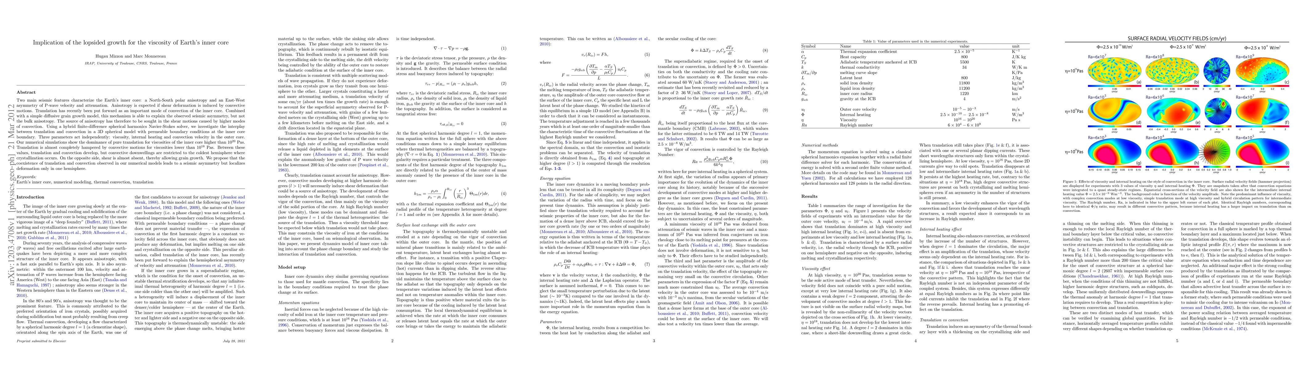 Two main seismic features characterize the Earth's inner core: a North-South polar anisotropy and an East-West asymmetry of P-wave velocity and attenuation. Anisotropy is expected if shear deformation is induced by convective motions. Translation has recently been put forward as an important mode of convection of the inner core. Combined with a simple diffusive grain growth model, this mechanism is able to explain the observed seismic asymmetry, but not the bulk anisotropy. The source of anisotropy has therefore to be sought in the shear motions caused by higher modes of convection. Using a hybrid finite-difference spherical harmonics Navier-Stokes solver, we investigate the interplay between translation and convection in a 3D spherical model with permeable boundary conditions at the inner core boundary. Three parameters act independently: viscosity, internal heating and convection velocity in the outer core. Our numerical simulations show the dominance of pure translation for viscosities of the inner core higher than $10^{20}$ Pas. Translation is almost completely hampered by convective motions for viscosities lower than $10^{18}$ Pas. Between these values, translation and convection develop, but convective downwellings are restricted to the coldest hemisphere where crystallization occurs. On the opposite side, shear is almost absent, thereby allowing grain growth. We propose that the coexistence of translation and convection observed in our numerical models leads to a seismic asymmetry but localizes deformation only in one hemisphere.