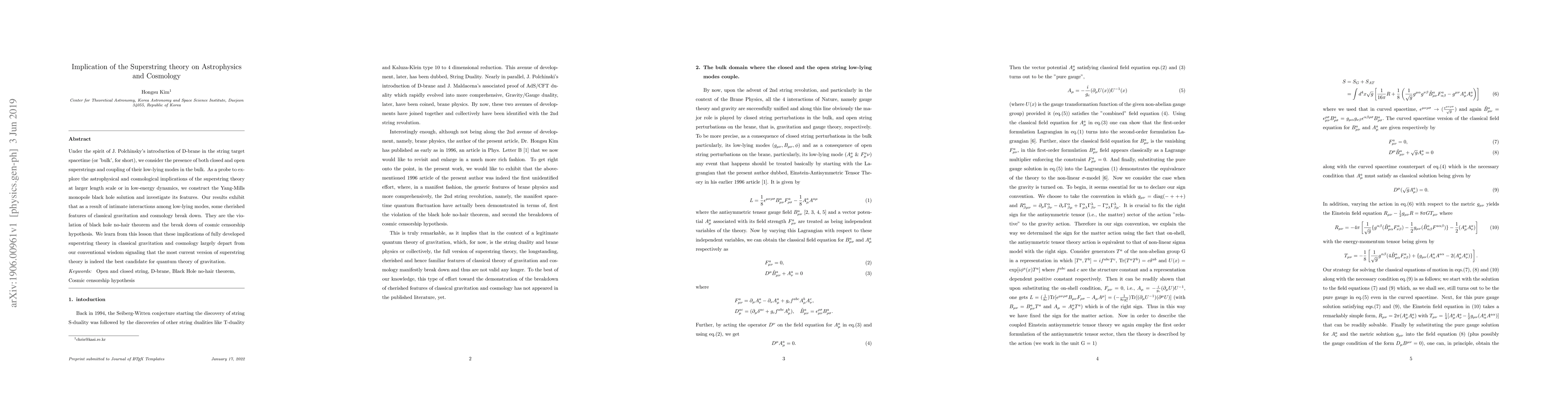 Under the spirit of J. Polchinsky's introduction of D-brane in the string target spacetime (or 'bulk', for short), we consider the presence of both closed and open superstrings and coupling of their low-lying modes in the bulk. As a probe to explore the astrophysical and cosmological implications of the superstring theory at larger length scale or in low-energy dynamics, we construct the Yang-Mills monopole black hole solution and investigate its features. Our results exhibit that as a result of intimate interactions among low-lying modes, some cherished features of classical gravitation and cosmology break down. They are the violation of black hole no-hair theorem and the break down of cosmic censorship hypothesis. We learn from this lesson that these implications of fully developed superstring theory in classical gravitation and cosmology largely depart from our conventional wisdom signaling that the most current version of superstring theory is indeed the best candidate for quantum theory of gravitation.