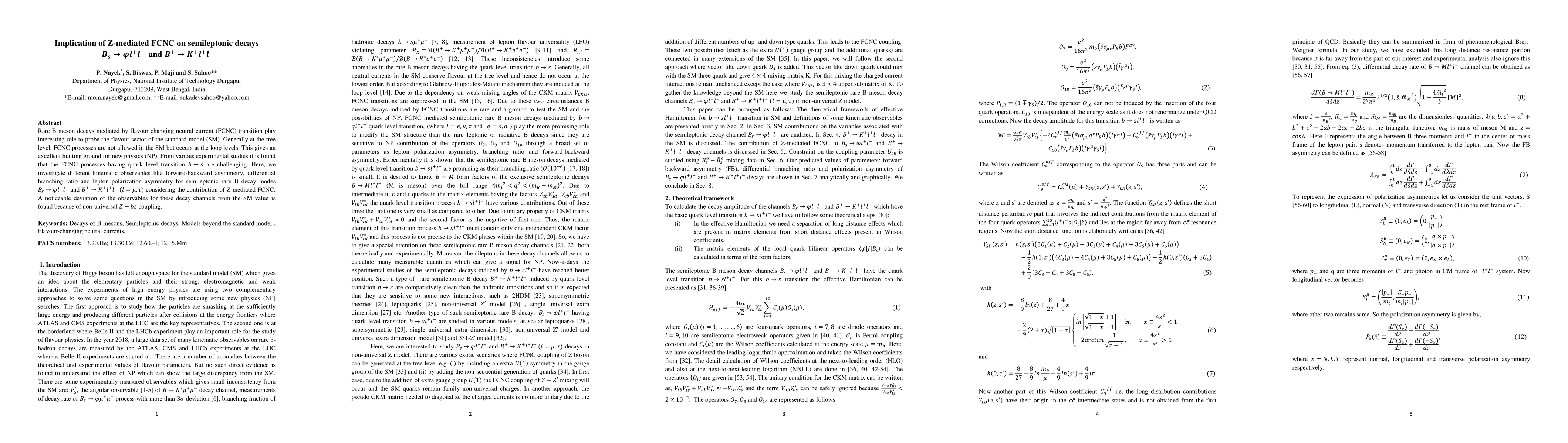 This paper examines the impact of Z-mediated flavor-changing neutral current (FCNC) processes on the semileptonic decays $B_s \to \phi l^+ l^-$ and $B^+ \to K^+ l^+ l^-$, finding significant deviations from Standard Model predictions due to non-universal $Z$-$bs$ coupling. The study highlights the potential for new physics through kinematic observables like forward-backward asymmetry and differential branching ratios.