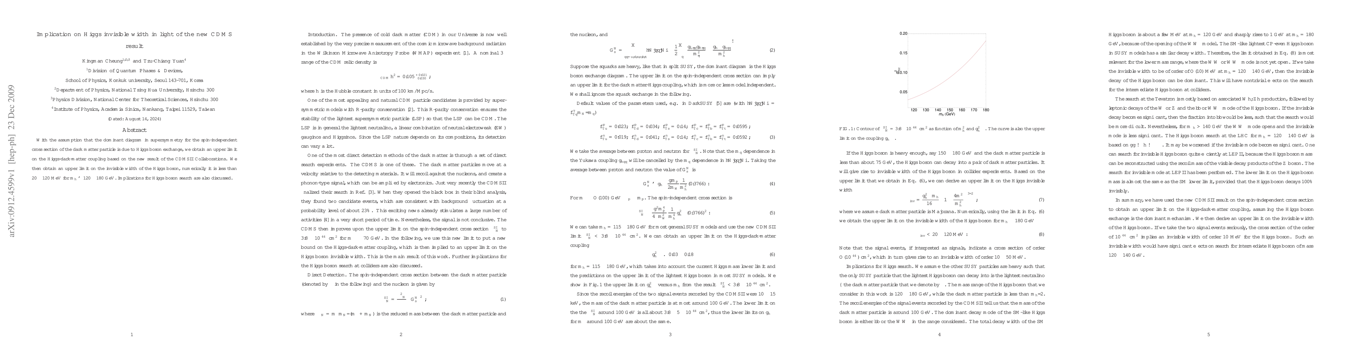 With the assumption that the dominant diagram in supersymmetry for the spin-independent cross section of the dark matter particle is due to Higgs boson exchange, we obtain an upper limit on the Higgs-dark-matter coupling based on the new result of the CDMSII Collaborations. We then obtain an upper limit on the invisible width of the Higgs boson, numerically it is less than 20-120 MeV for $m_h \simeq 120 - 180$ GeV. Implications for Higgs boson search are also discussed.