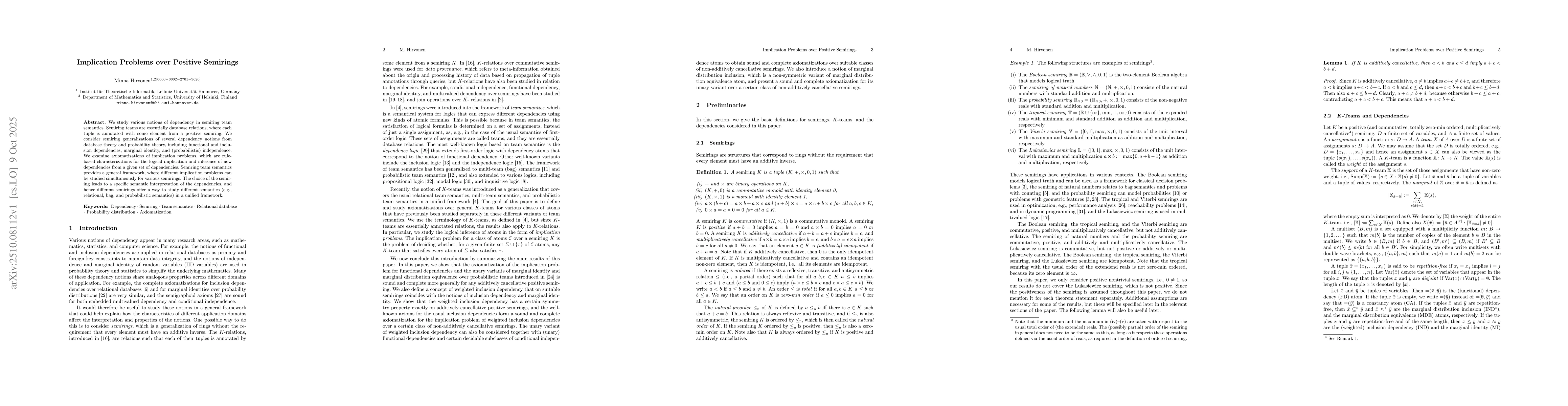 Developed a unified framework for analyzing implication problems across different semiring classes, extending existing axiomatizations and complexity results to broader logical systems