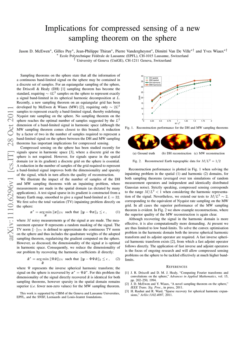 This paper introduces a new sampling theorem on the sphere that reduces the required samples by half compared to existing equiangular methods, significantly impacting compressed sensing by lowering dimensionality and enhancing sparsity. The authors demonstrate superior reconstruction performance in a sphere inpainting problem using this new sampling theorem.