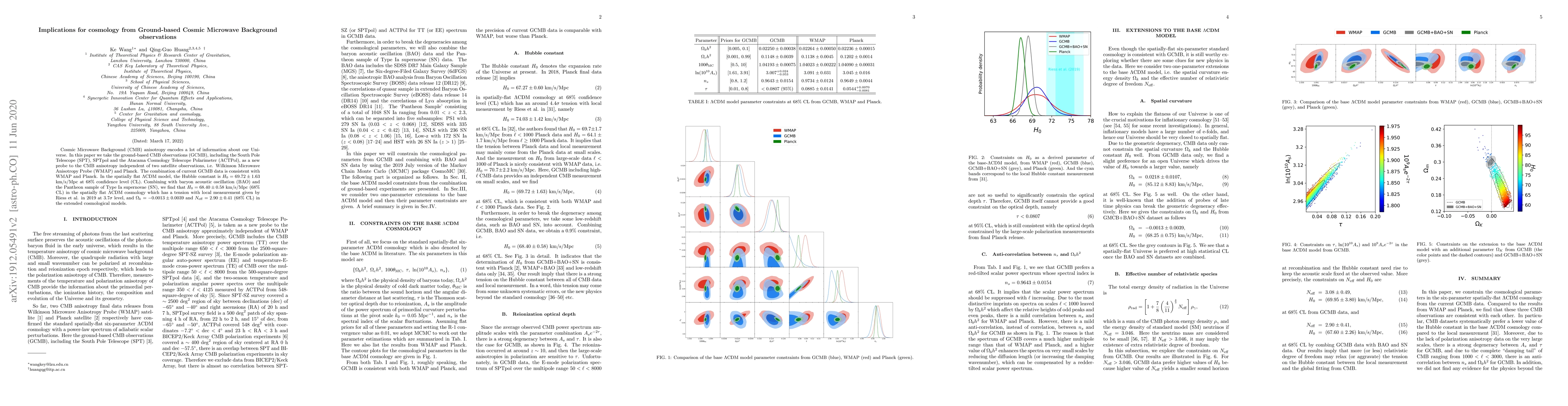 This paper analyzes ground-based CMB observations to extract cosmological parameters, finding a Hubble constant of $H_0=69.72\pm 1.63$ km/s/Mpc. Combined with BAO and SN data, it yields $H_0=68.40\pm 0.58$ km/s/Mpc, showing a $3.7\sigma$ tension with local measurements.