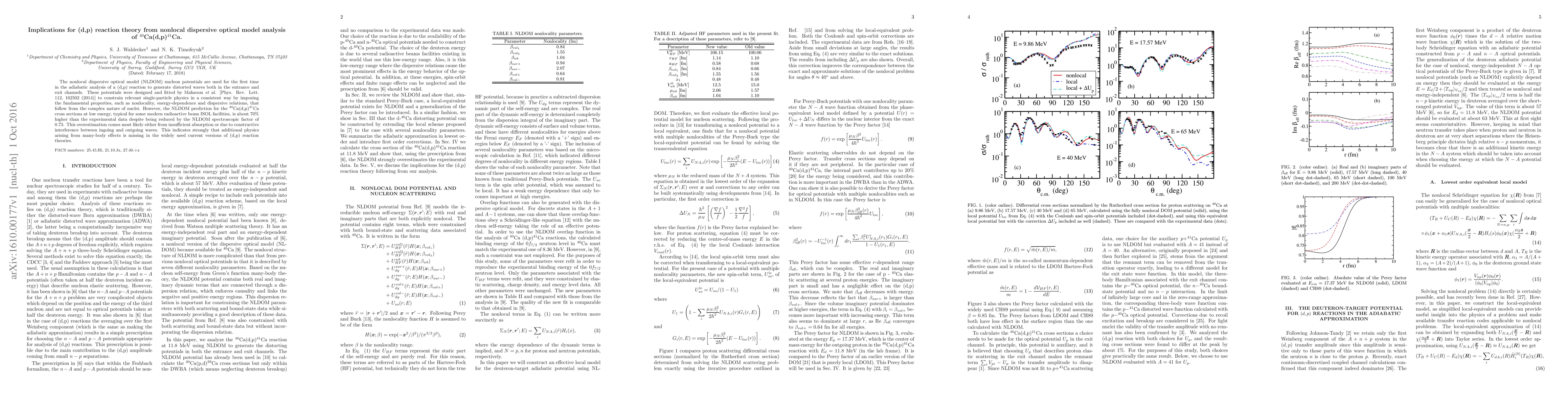 The nonlocal dispersive optical model (NLDOM) nucleon potentials are used for the first time in the adiabatic analysis of a (d,p) reaction to generate distorted waves both in the entrance and exit channels. These potentials were designed and fitted by Mahzoon $et \text{ } al.$ [Phys. Rev. Lett. 112, 162502 (2014)] to constrain relevant single-particle physics in a consistent way by imposing the fundamental properties, such as nonlocality, energy-dependence and dispersive relations, that follow from the complex nature of nuclei. However, the NLDOM prediction for the $^{40}$Ca(d,p)$^{41}$Ca cross sections at low energy, typical for some modern radioactive beam ISOL facilities, is about 70$\%$ higher than the experimental data despite being reduced by the NLDOM spectroscopic factor of 0.73. This overestimation comes most likely either from insufficient absorption or due to constructive interference between ingoing and outgoing waves. This indicates strongly that additional physics arising from many-body effects is missing in the widely used current versions of (d,p) reaction theories.