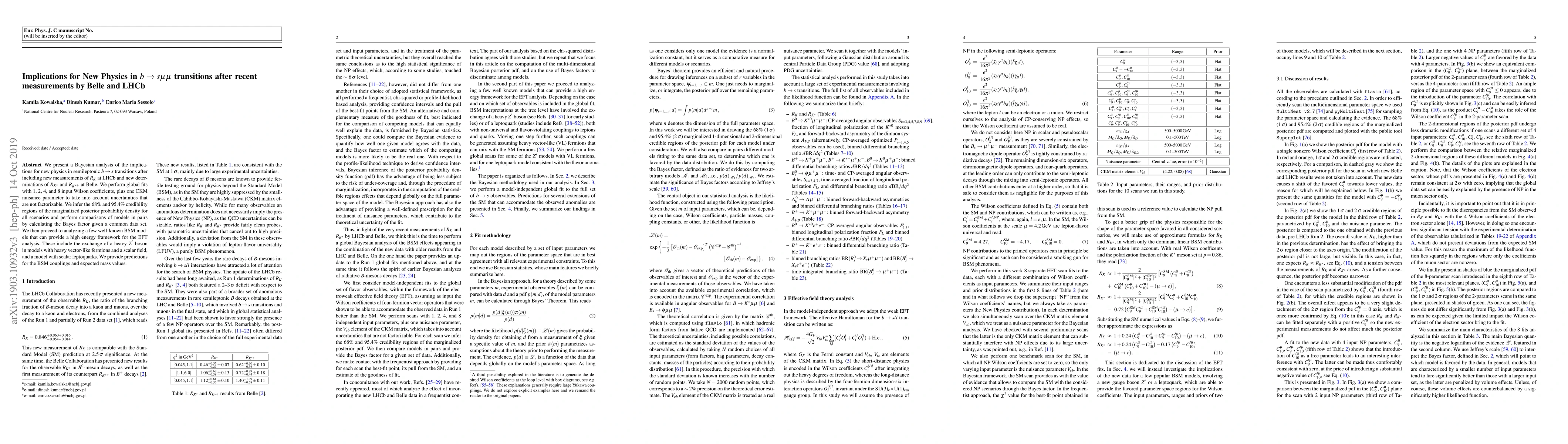 We present a Bayesian analysis of the implications for new physics in semileptonic $b\to s$ transitions after including new measurements of $R_K$ at LHCb and new determinations of $R_{K^*}$ and $R_{K^{*+}}$ at Belle. We perform global fits with 1, 2, 4, and 8 input Wilson coefficients, plus one CKM nuisance parameter to take into account uncertainties that are not factorizable. We infer the 68% and 95.4% credibility regions of the marginalized posterior probability density for all scenarios and perform comparisons of models in pairs by calculating the Bayes factor given a common data set. We then proceed to analyzing a few well known BSM models that can provide a high energy framework for the EFT analysis. These include the exchange of a heavy $Z^{'}$ boson in models with heavy vector-like fermions and a scalar field, and a model with scalar leptoquarks. We provide predictions for the BSM couplings and expected mass values.