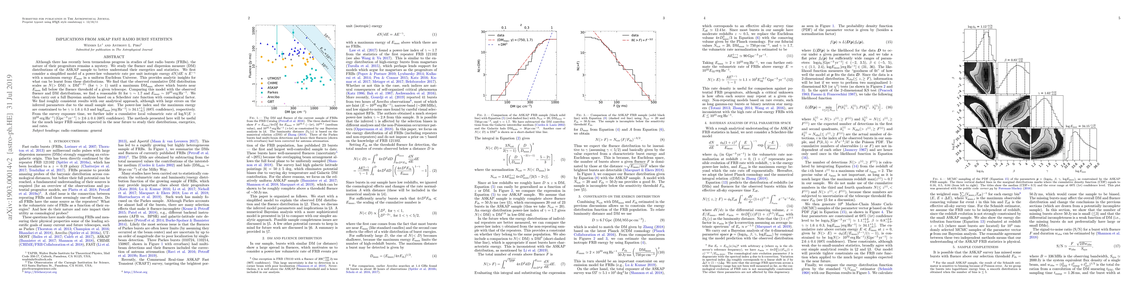 Researchers analyzed Fast Radio Burst (FRB) statistics using ASKAP data to understand their energetics and rates, finding a likely power-law index of gamma = 1.6 +/-.3 and maximum energy E_max = 10^{33} erg/Hz.