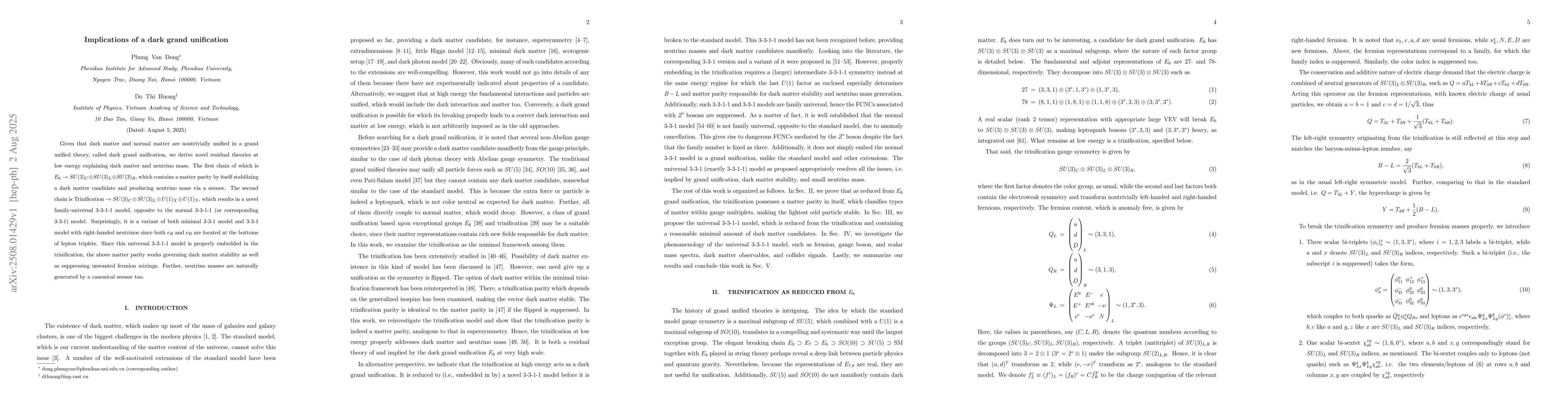 Given that dark matter and normal matter are nontrivially unified in a grand unified theory, called dark grand unification, we derive novel residual theories at low energy explaining dark matter and neutrino mass. The first chain of which is $E_6\to SU(3)_C\otimes SU(3)_L\otimes SU(3)_R$, which contains a matter parity by itself stabilizing a dark matter candidate and producing neutrino mass via a seesaw. The second chain is $\mathrm{Trinification}\to SU(3)_C \otimes SU(3)_L\otimes U(1)_X\otimes U(1)_N$, which results in a novel family-universal 3-3-1-1 model, opposite to the normal 3-3-1-1 (or corresponding 3-3-1) model. Surprisingly, it is a variant of both minimal 3-3-1 model and 3-3-1 model with right-handed neutrinos since both $e_R$ and $\nu_R$ are located at the bottoms of lepton triplets. Since this universal 3-3-1-1 model is properly embedded in the trinification, the above matter parity works governing dark matter stability as well as suppressing unwanted fermion mixings. Further, neutrino masses are naturally generated by a canonical seesaw too.