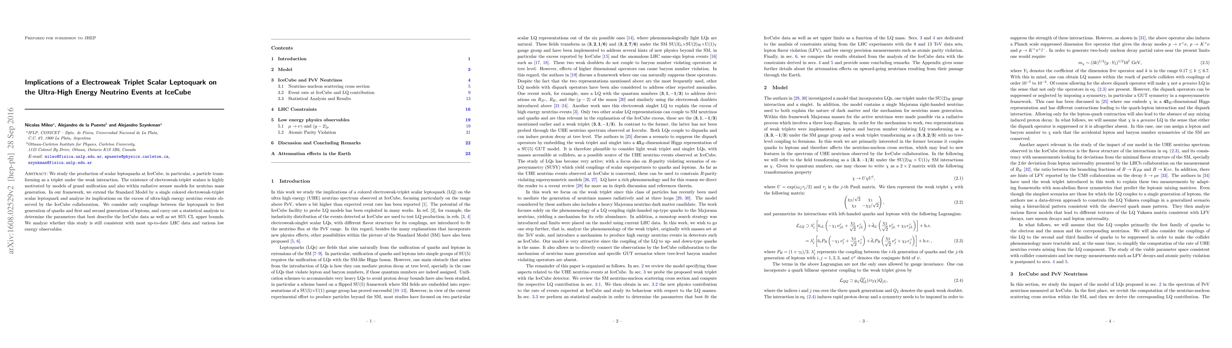 This paper explores the potential role of a triplet scalar leptoquark in explaining the excess of ultra-high energy neutrino events detected by IceCube, extending the Standard Model with this particle. The study sets $95\%$ CL upper bounds and assesses consistency with LHC data and low-energy observables.