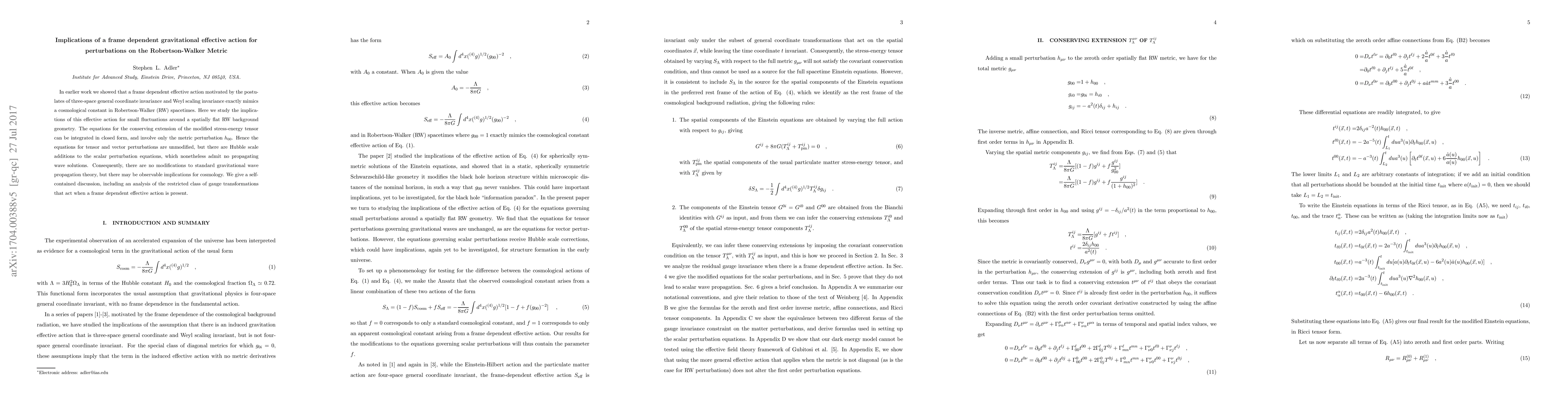 This paper investigates how a frame-dependent gravitational effective action influences perturbations in a Robertson-Walker metric, finding no changes to tensor or vector perturbations but introducing Hubble scale additions to scalar perturbations that do not propagate. The study concludes with an analysis of gauge transformations under this effective action.