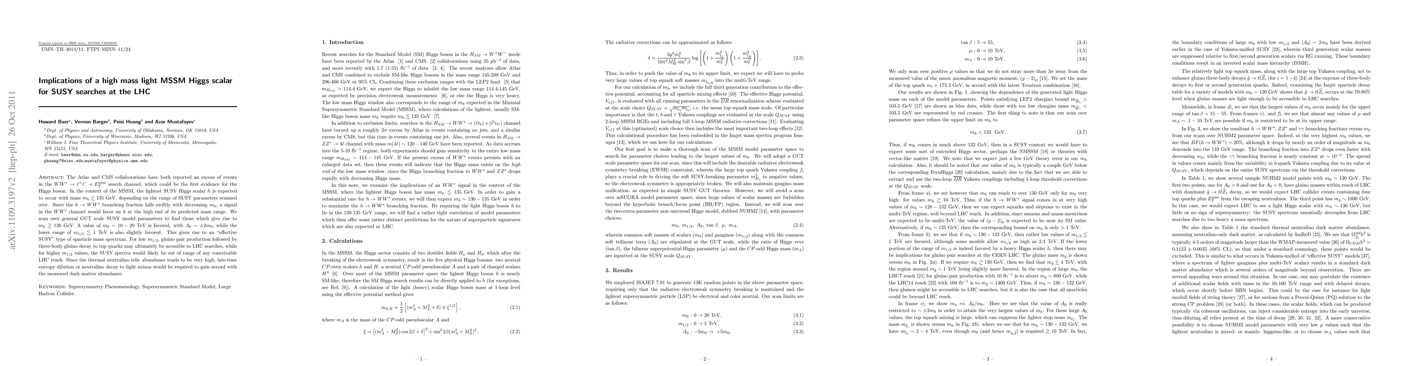 The Atlas and CMS collaborations have both reported an excess of events in the WW\star \rightarrow \ell+\ell- + ETmiss search channel, which could be the first evidence for the Higgs boson. In the context of the MSSM, the lightest SUSY Higgs scalar h is expected to occur with mass mh = 135 GeV, depending on the range of SUSY parameters scanned over. Since the h \rightarrow WW\star branching fraction falls swiftly with decreasing mh, a signal in the WW\star channel would favor an h at the high end of its predicted mass range. We scan over general GUT scale SUSY model parameters to find those which give rise to mh > 130 GeV. A value of m0 \sim 10 - 20 TeV is favored, with A0 \sim \pm2m0, while the lower range of m1/2 < 1 TeV is also slightly favored. This gives rise to an "effective SUSY" type of sparticle mass spectrum. For low m1/2, gluino pair production followed by three-body gluino decay to top quarks may ultimately be accesible to LHC searches, while for higher m1/2 values, the SUSY spectra would likely be out of range of any conceivable LHC reach. Since the thermal neutralino relic abundance tends to be very high, late-time entropy dilution or neutralino decay to light axinos would be required to gain accord with the measured dark matter abundance