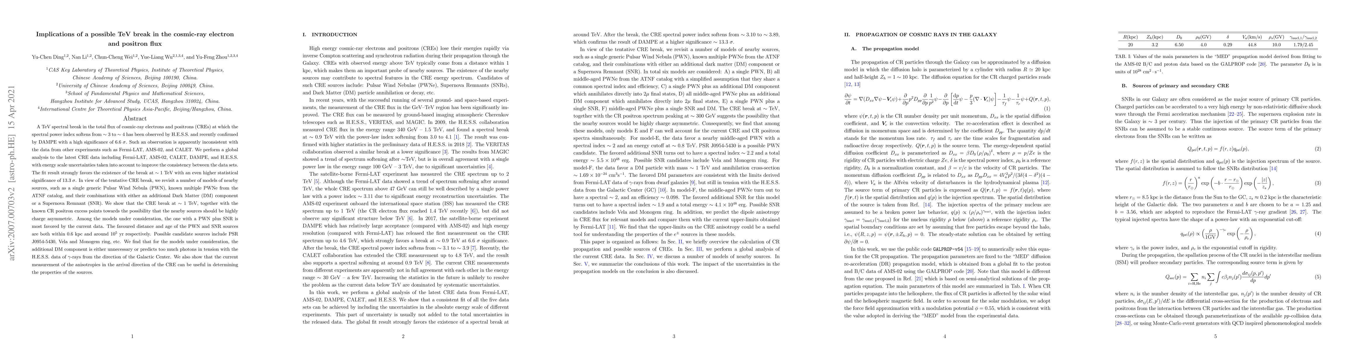 A TeV spectral break in the total flux of cosmic-ray electrons and positrons (CREs) at which the spectral power index softens from $\sim 3$ to $\sim 4$ has been observed by H.E.S.S. and recently confirmed by DAMPE with a high significance of $6.6~\sigma$. Such an observation is apparently inconsistent with the data from other experiments such as Fermi-LAT, AMS-02 and CALET. We perform a global analysis to the latest CRE data including Fermi-LAT, AMS-02, CALET, DAMPE and H.E.S.S. with energy scale uncertainties taken into account to improve the consistency between the data sets. The fit result strongly favors the existence of the break at $\sim 1$ TeV with an even higher statistical significance of $13.3~\sigma$. In view of the tentative CRE break, we revisit a number of models of nearby sources, such as a single generic Pulsar Wind Nebula (PWN), known multiple PWNe from the ATNF catalog, and their combinations with either an additional Dark Matter (DM) component or a Supernova Remnant (SNR). We show that the CRE break at $\sim 1$ TeV, together with the known CR positron excess points towards the possibility that the nearby sources should be highly charge asymmetric. Among the models under consideration, the one with a PWN plus SNR is most favored by the current data. The favoured distance and age of the PWN and SNR sources are both within $0.6$ kpc and around $10^{5}$ yr respectively. Possible candidate sources include PSR J0954-5430, Vela and Monogem ring, etc. We find that for the models under consideration, the additional DM component is either unnecessary, or predicts too much photons in tension with the H.E.S.S. data of $\gamma$-rays from the direction of the Galactic Center. We also show that the current measurement of the anisotropies in the arrival direction of the CRE can be useful in determining the property of the sources.