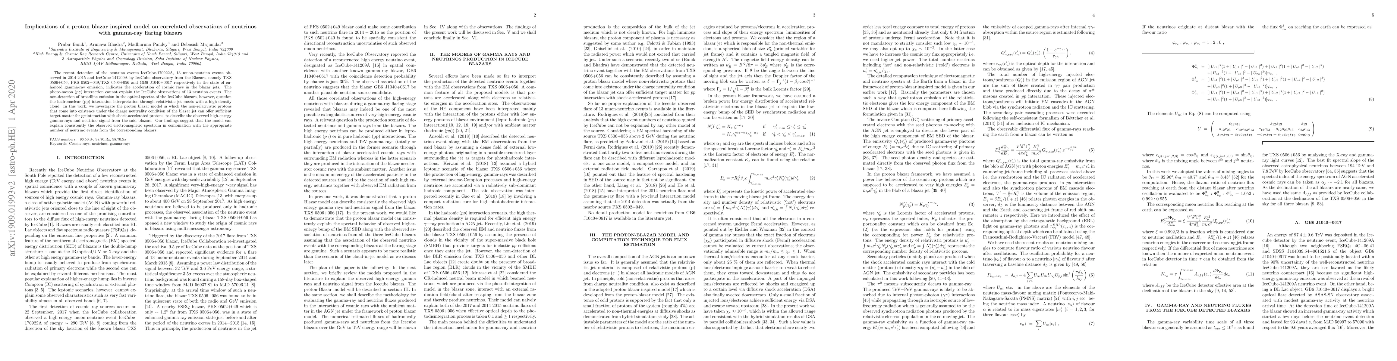 Recent detection of the neutrino events IceCube-170922A, 13 muon-neutrino events observed in 2014-2015 and IceCube-141209A by IceCube observatory from the Blazars, namely TXS 0506+056, PKS 0502+049/TXS 0506+056 and GB6 J1040+0617 respectively in the state of enhanced gamma-ray emission, indicates the acceleration of cosmic rays in the blazar jets. The photo-meson ($p\gamma$) interaction cannot explain the IceCube observations of 13 neutrino events. The non-detection of broadline emission in the optical spectra of the IceCube blazars, however, question the hadronuclear (pp) interaction interpretation through relativistic jet meets with high density cloud. In this work, we investigate the proton blazar model in which the non-relativistic protons that come into existence under the charge neutrality condition of the blazar jet can offer sufficient target matter for $pp$ interaction with shock-accelerated protons, to describe the observed high-energy gamma-rays and neutrino signal from the said blazars. Our findings suggest that the model can explain consistently the observed electromagnetic spectrum in combination with appropriate number of neutrino events from the corresponding blazars.