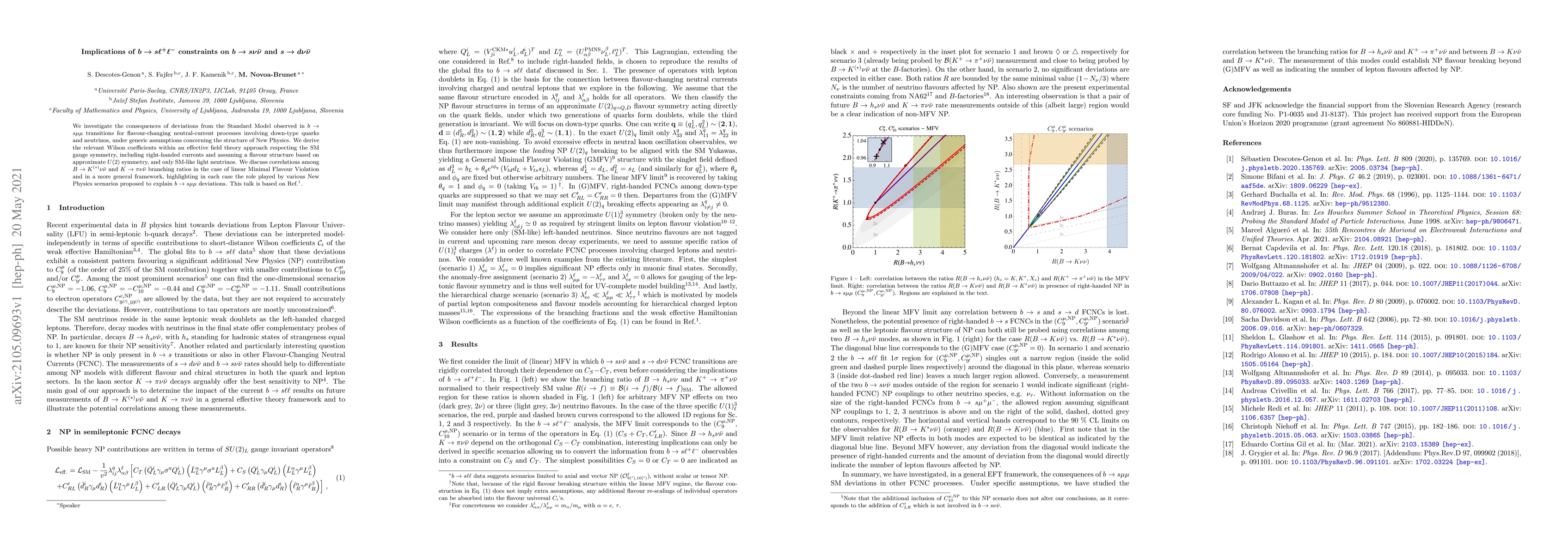 We investigate the consequences of deviations from the Standard Model observed in $b\to s\mu\mu$ transitions for flavour-changing neutral-current processes involving down-type quarks and neutrinos, under generic assumptions concerning the structure of New Physics. We derive the relevant Wilson coefficients within an effective field theory approach respecting the SM gauge symmetry, including right-handed currents and assuming a flavour structure based on approximate $U(2)$ symmetry, and only SM-like light neutrinos. We discuss correlations among $B \to K^{(*)} \nu \bar \nu$ and $K\to \pi \nu \bar \nu$ branching ratios in the case of linear Minimal Flavour Violation and in a more general framework, highlighting in each case the role played by various New Physics scenarios proposed to explain $b\to s\mu\mu$ deviations. This talk is based on arXiv:2005.03734.