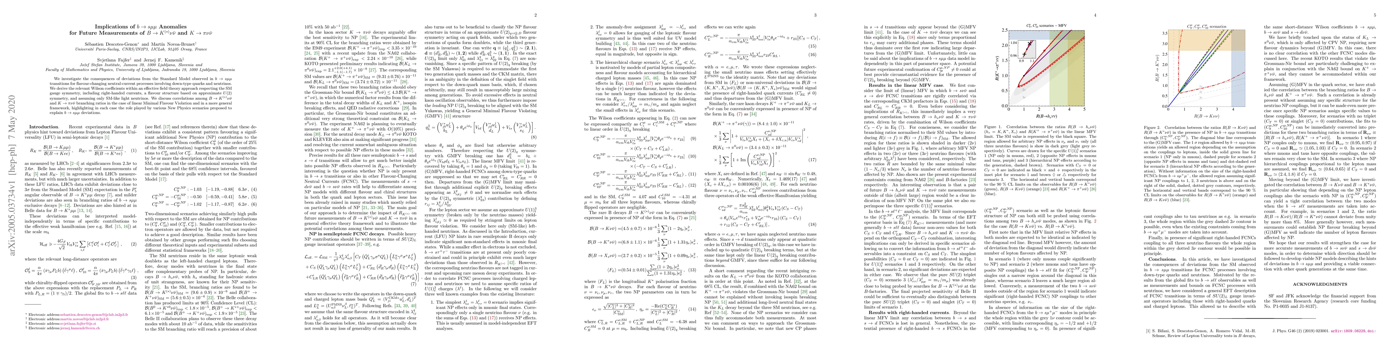 We investigate the consequences of deviations from the Standard Model observed in $b\to s\mu\mu$ transitions for flavour-changing neutral-current processes involving down-type quarks and neutrinos. We derive the relevant Wilson coefficients within an effective field theory approach respecting the SM gauge symmetry, including right-handed currents, a flavour structure based on approximate $U(2)$ symmetry, and assuming only SM-like light neutrinos. We discuss correlations among $B \to K^{(*)} \nu \bar \nu$ and $K\to \pi \nu \bar \nu$ branching ratios in the case of linear Minimal Flavour Violation and in a more general framework, highlighting in each case the role played by various New Physics scenarios proposed to explain $b\to s\mu\mu$ deviations.