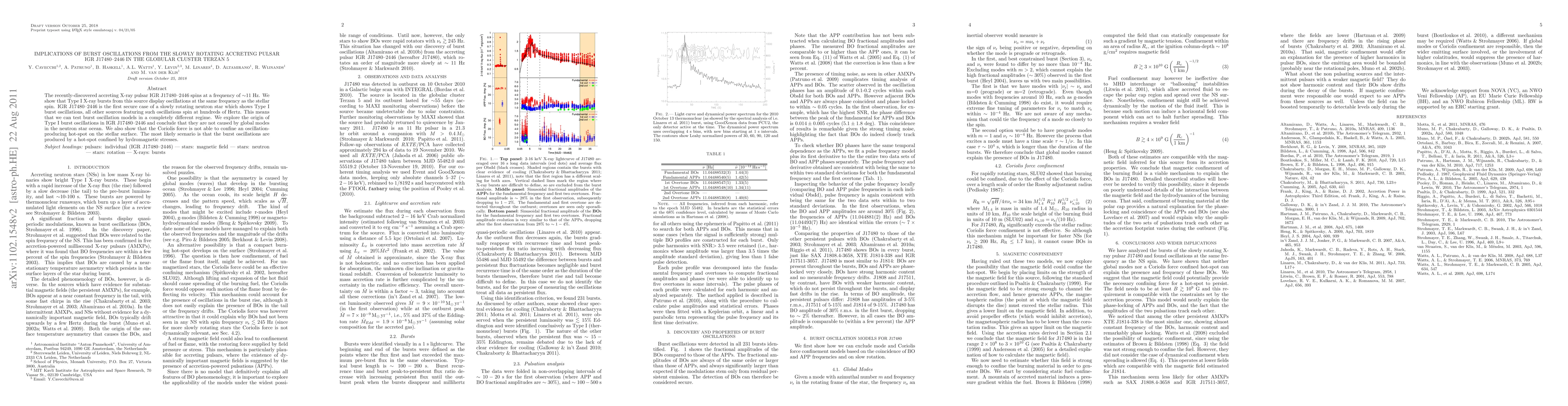 The recently-discovered accreting X-ray pulsar IGR J17480--2446 spins at a frequency of ~11 Hz. We show that Type I X-ray bursts from this source display oscillations at the same frequency as the stellar spin. IGR J17480--2446 is the first secure case of a slowly rotating neutron star which shows Type I burst oscillations, all other sources featuring such oscillations spin at hundreds of Hertz. This means that we can test burst oscillation models in a completely different regime. We explore the origin of Type I burst oscillations in IGR J17480--2446 and conclude that they are not caused by global modes in the neutron star ocean. We also show that the Coriolis force is not able to confine an oscillation-producing hot-spot on the stellar surface. The most likely scenario is that the burst oscillations are produced by a hot-spot confined by hydromagnetic stresses.