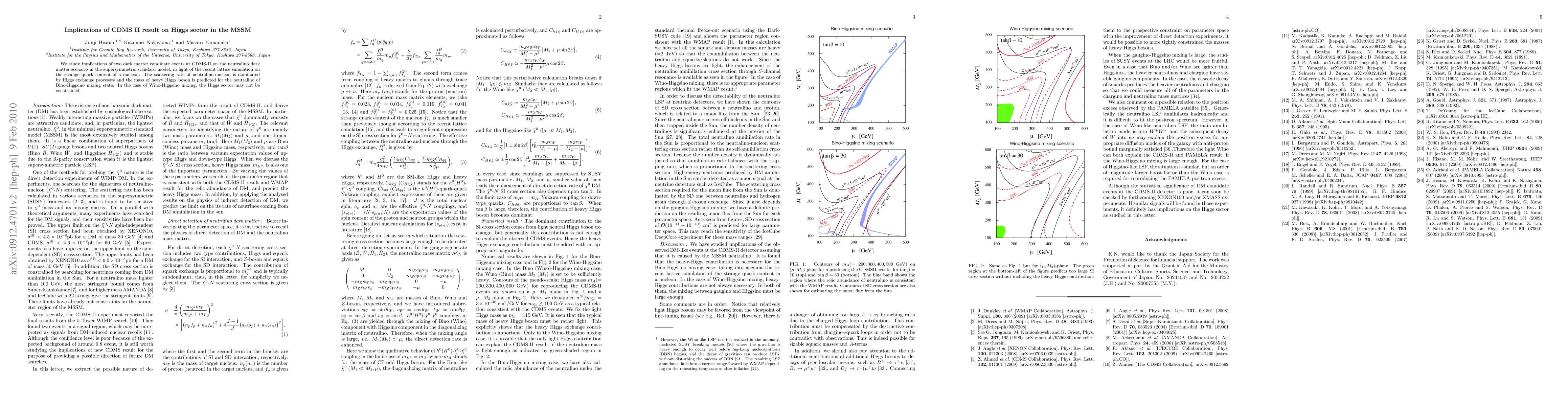 This paper examines how two dark matter candidate events from CDMS-II affect neutralino dark matter in the MSSM, considering recent lattice simulations on strange quark content. It predicts the heavy Higgs boson mass for Bino-Higgsino mixed neutralinos, but finds no constraints on the Higgs sector in Wino-Higgsino mixed scenarios.