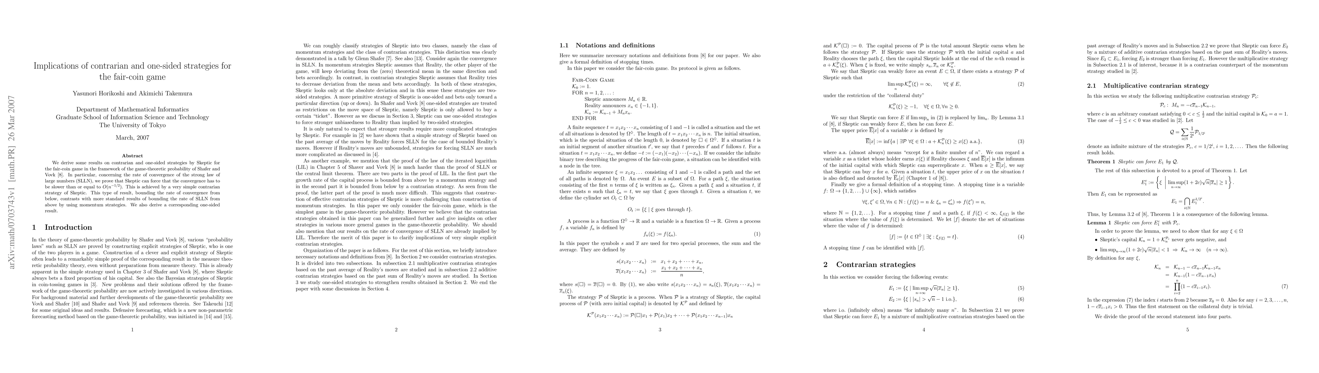 This paper explores contrarian and one-sided strategies for the fair-coin game, showing that Skeptic can enforce a slower convergence rate of $O(n^{-1/2})$ for the strong law of large numbers, contrasting with typical momentum strategies. It also presents a corresponding one-sided result.