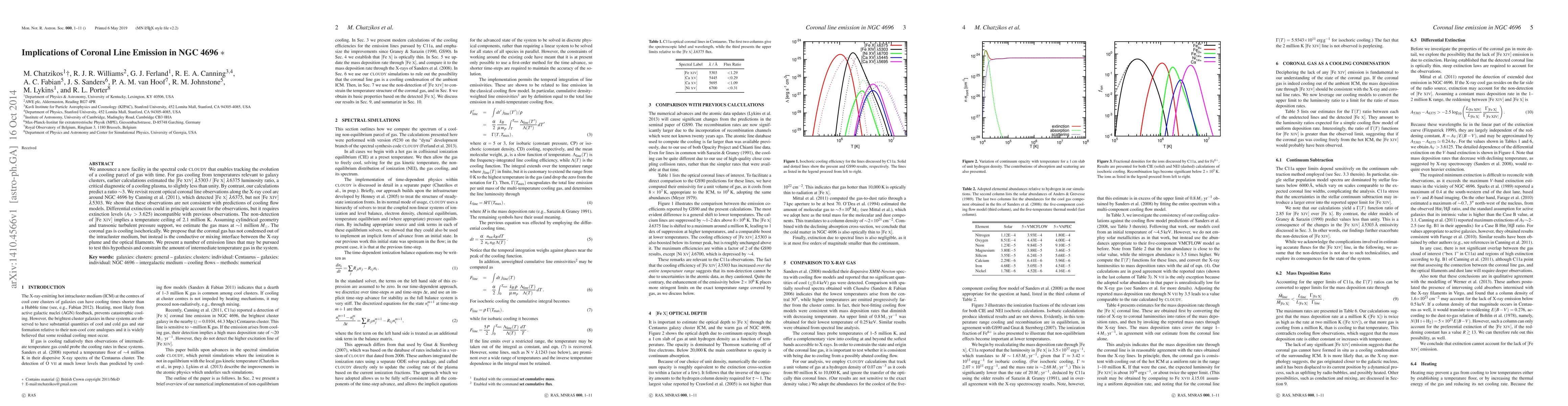 We announce a new facility in the spectral code CLOUDY that enables tracking the evolution of a cooling parcel of gas with time. For gas cooling from temperatures relevant to galaxy clusters, earlier calculations estimated the [Fe XIV] {\lambda}5303 / [Fe X] {\lambda}6375 luminosity ratio, a critical diagnostic of a cooling plasma, to slightly less than unity. By contrast, our calculations predict a ratio ~3. We revisit recent optical coronal line observations along the X-ray cool arc around NGC 4696 by Canning et al. (2011), which detected [Fe X] {\lambda}6375, but not [Fe XIV] {\lambda}5303. We show that these observations are not consistent with predictions of cooling flow models. Differential extinction could in principle account for the observations, but it requires extinction levels (A_V > 3.625) incompatible with previous observations. The non-detection of [Fe XIV] implies a temperature ceiling of 2.1 million K. Assuming cylindrical geometry and transonic turbulent pressure support, we estimate the gas mass at ~1 million solar masses. The coronal gas is cooling isochorically. We propose that the coronal gas has not condensed out of the intracluster medium, but instead is the conductive or mixing interface between the X-ray plume and the optical filaments. We present a number of emission lines that may be pursued to test this hypothesis and constrain the amount of intermediate temperature gas in the system.