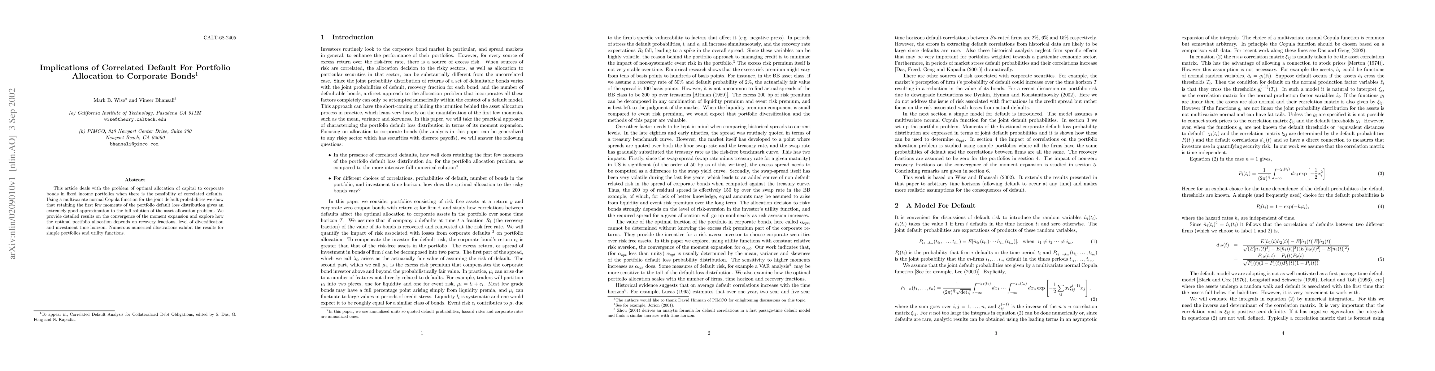 A study on portfolio allocation to corporate bonds when default risks are correlated, finding that retaining a few moments of the portfolio's loss distribution provides an accurate approximation for optimal allocation.