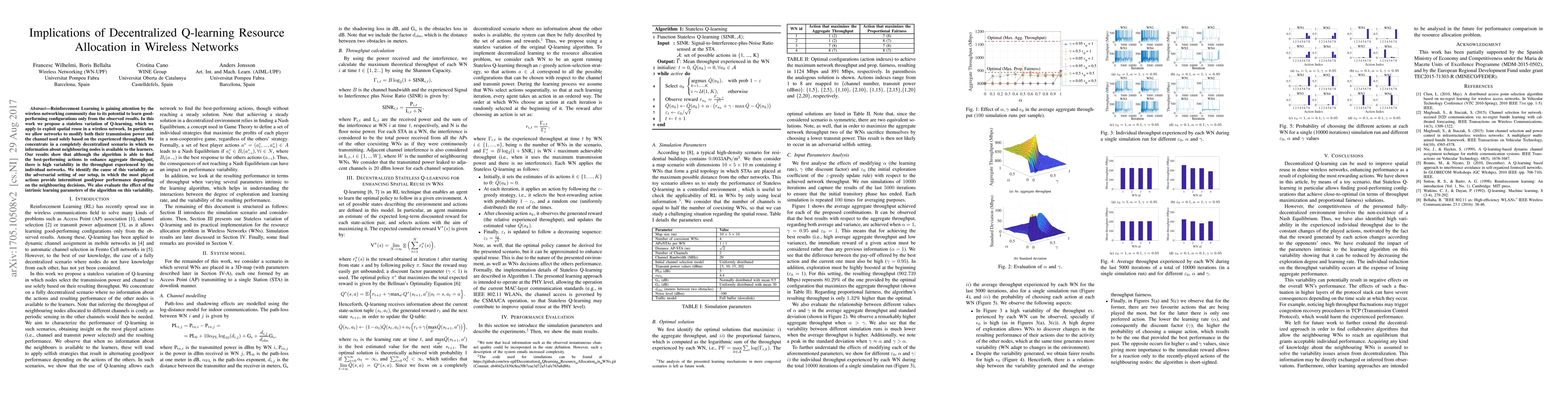 Reinforcement Learning is gaining attention by the wireless networking community due to its potential to learn good-performing configurations only from the observed results. In this work we propose a stateless variation of Q-learning, which we apply to exploit spatial reuse in a wireless network. In particular, we allow networks to modify both their transmission power and the channel used solely based on the experienced throughput. We concentrate in a completely decentralized scenario in which no information about neighbouring nodes is available to the learners. Our results show that although the algorithm is able to find the best-performing actions to enhance aggregate throughput, there is high variability in the throughput experienced by the individual networks. We identify the cause of this variability as the adversarial setting of our setup, in which the most played actions provide intermittent good/poor performance depending on the neighbouring decisions. We also evaluate the effect of the intrinsic learning parameters of the algorithm on this variability.