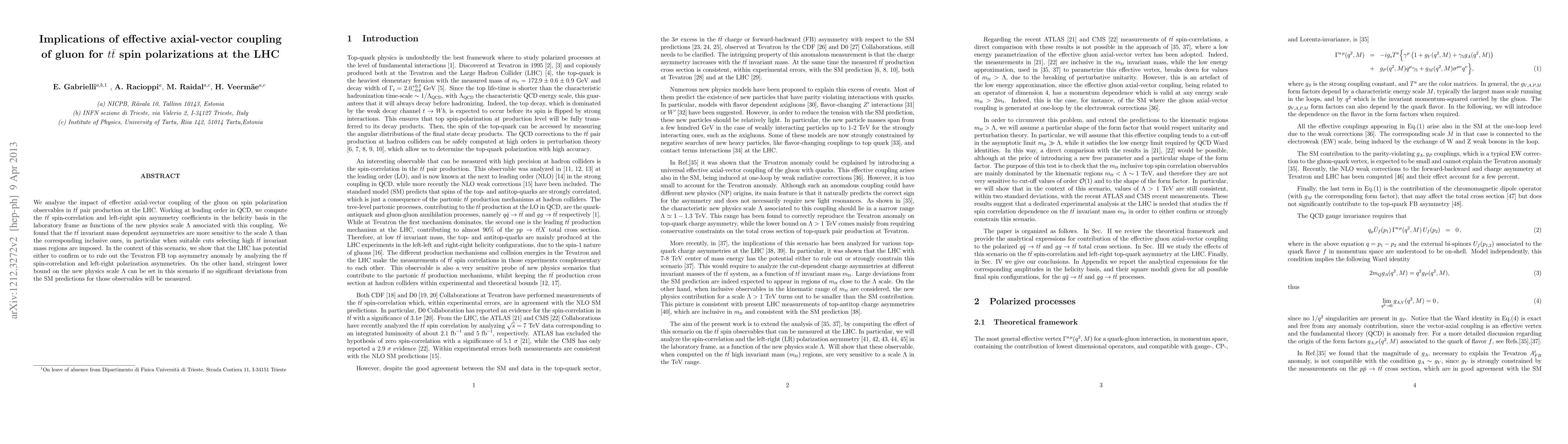 This study investigates the effects of effective axial-vector coupling of gluons on top-antitop quark spin polarizations at the LHC. Utilizing leading-order QCD calculations, the research determines how this new physics scale (Λ) influences spin-correlation and left-right asymmetry coefficients. The findings suggest that high top-antitop invariant mass regions are more sensitive to Λ, enabling the LHC to potentially validate or refute Tevatron's top asymmetry anomaly. Moreover, significant deviations from Standard Model predictions could lead to stricter bounds on Λ.
