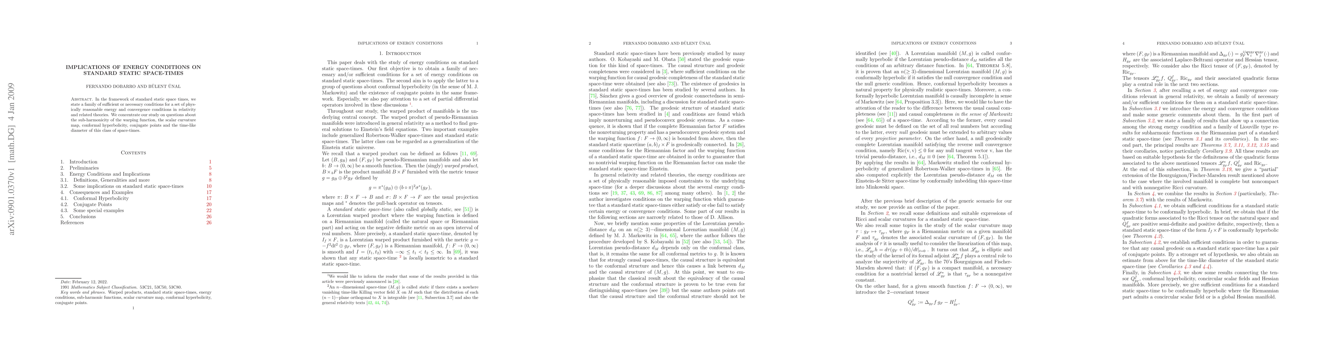 This paper establishes sufficient and necessary conditions for physically reasonable energy and convergence conditions in standard static space-times, focusing on sub-harmonicity, scalar curvature, conformal hyperbolicity, conjugate points, and time-like diameter. The study aims to explore the implications of these conditions on the structure of such space-times.