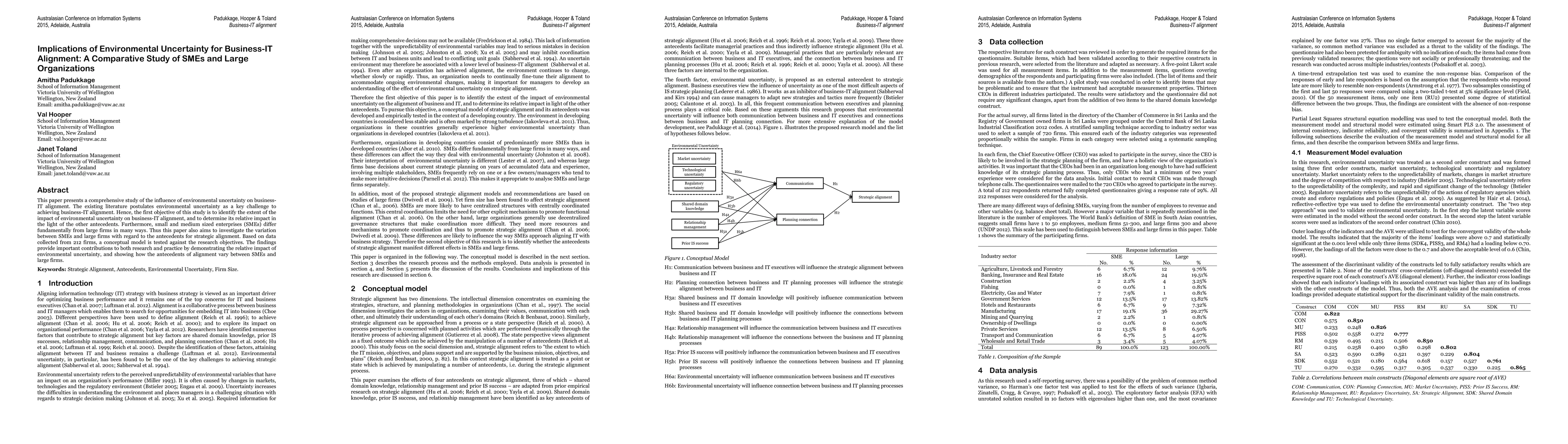 This study investigates the impact of environmental uncertainty on business-IT alignment, comparing SMEs and large firms. Findings reveal the relative significance of environmental uncertainty and highlight differences in alignment antecedents between small and large organizations.