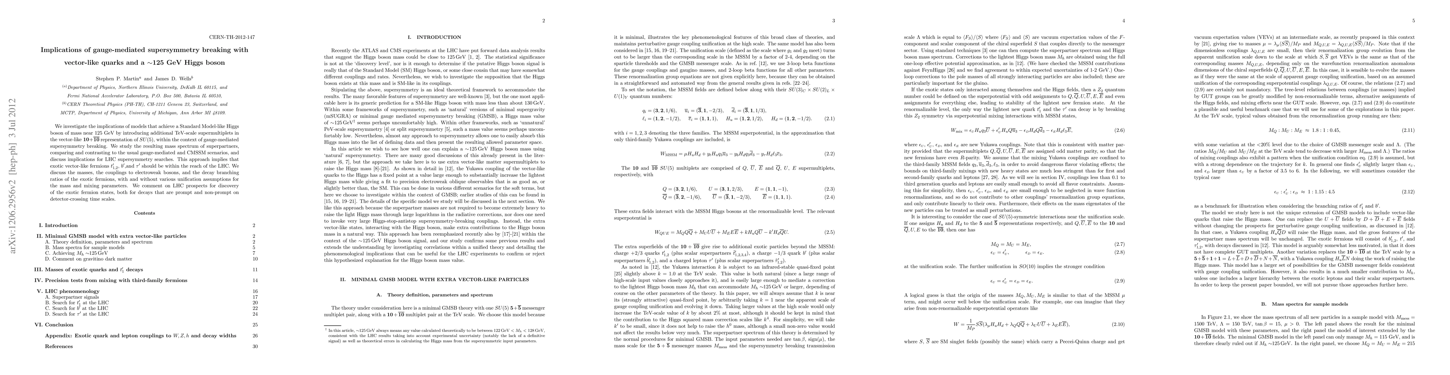 This paper explores gauge-mediated supersymmetry breaking models with vector-like quarks that yield a Standard Model-like Higgs boson around 125 GeV. It examines the mass spectrum of superpartners and discusses the implications for LHC searches, suggesting that exotic vector-like fermions may be detectable at the LHC.